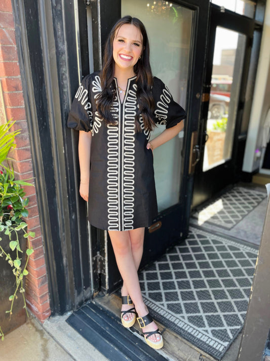 Black Embroidered Puff Sleeve Dress