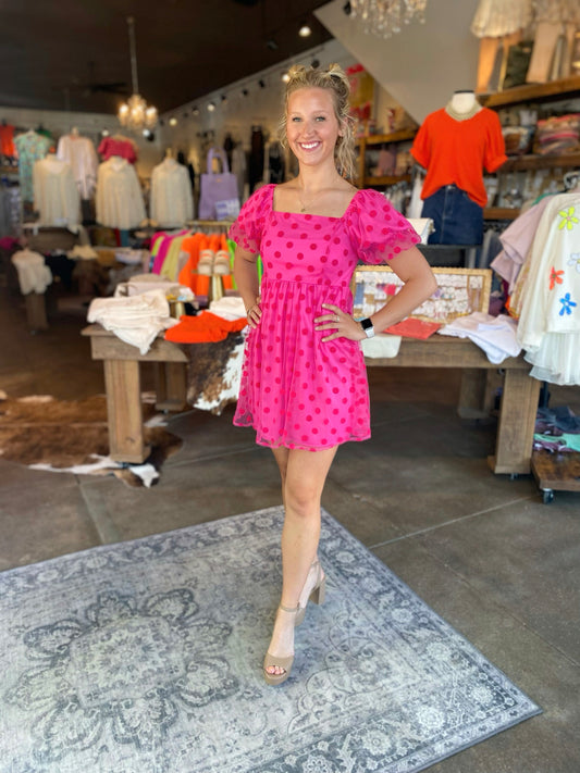Perfect Polka Dot mesh puff Sleeve Hot Pink lined Dress
