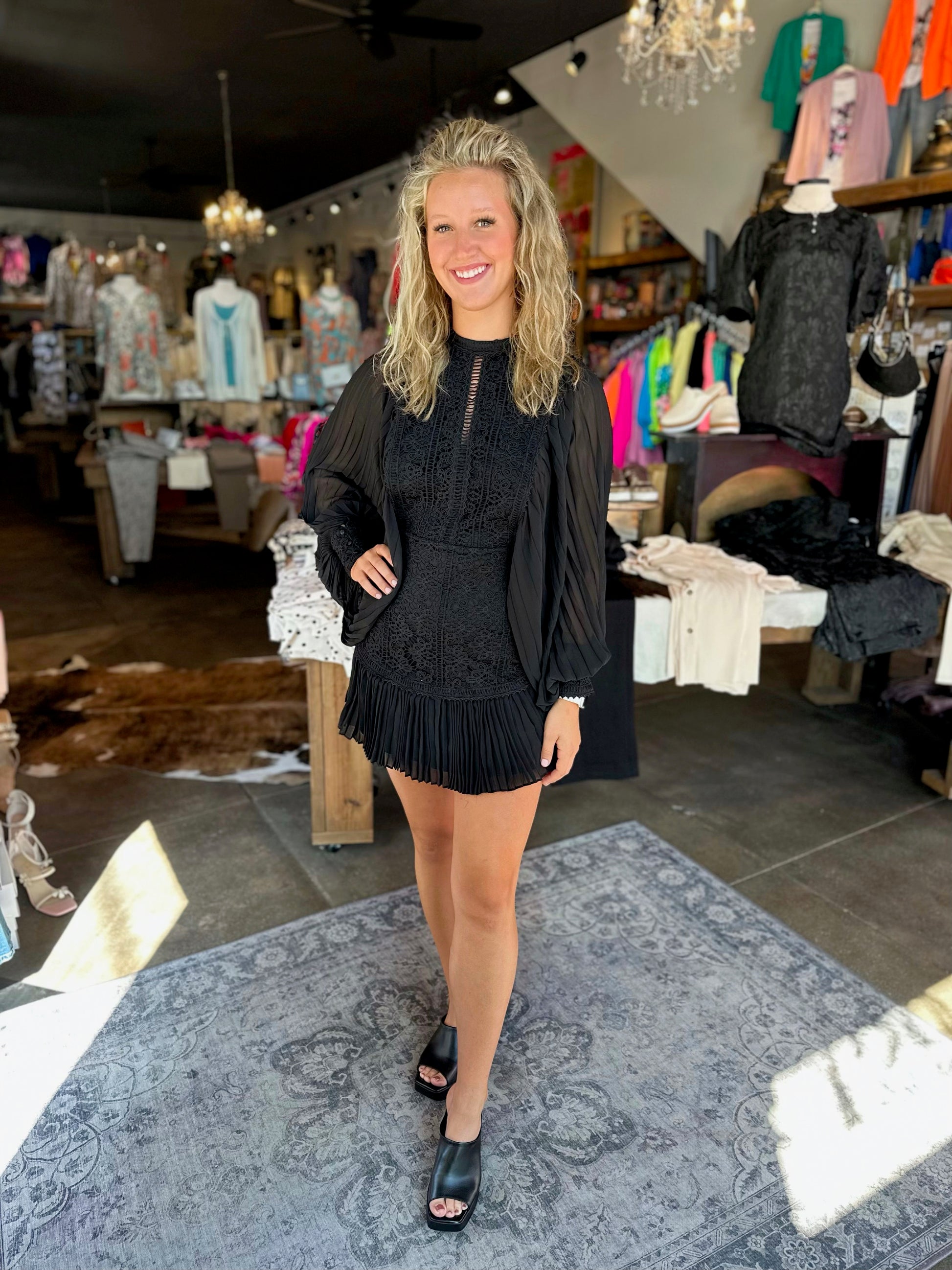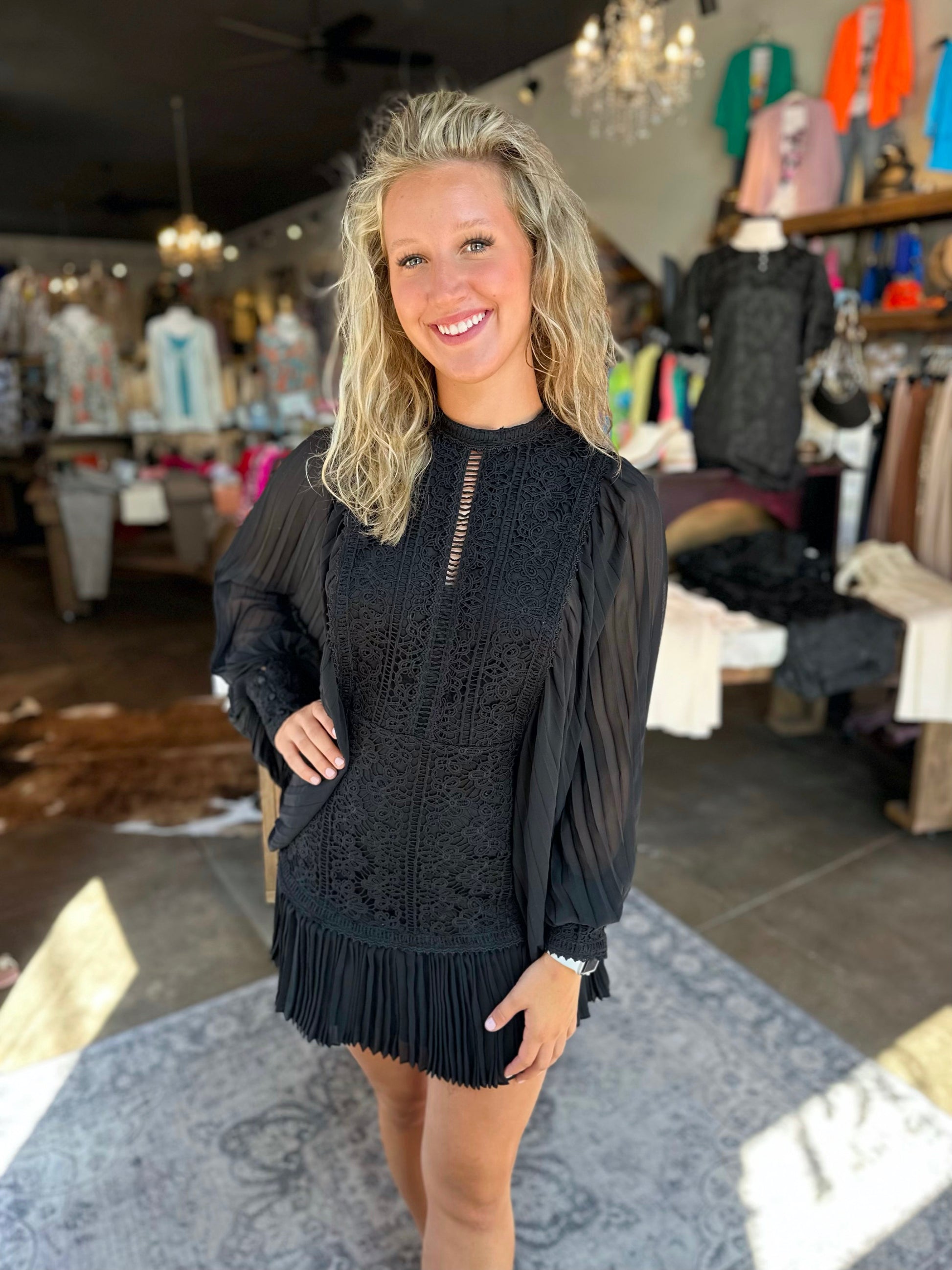Allover Lace Pleated Black Dress