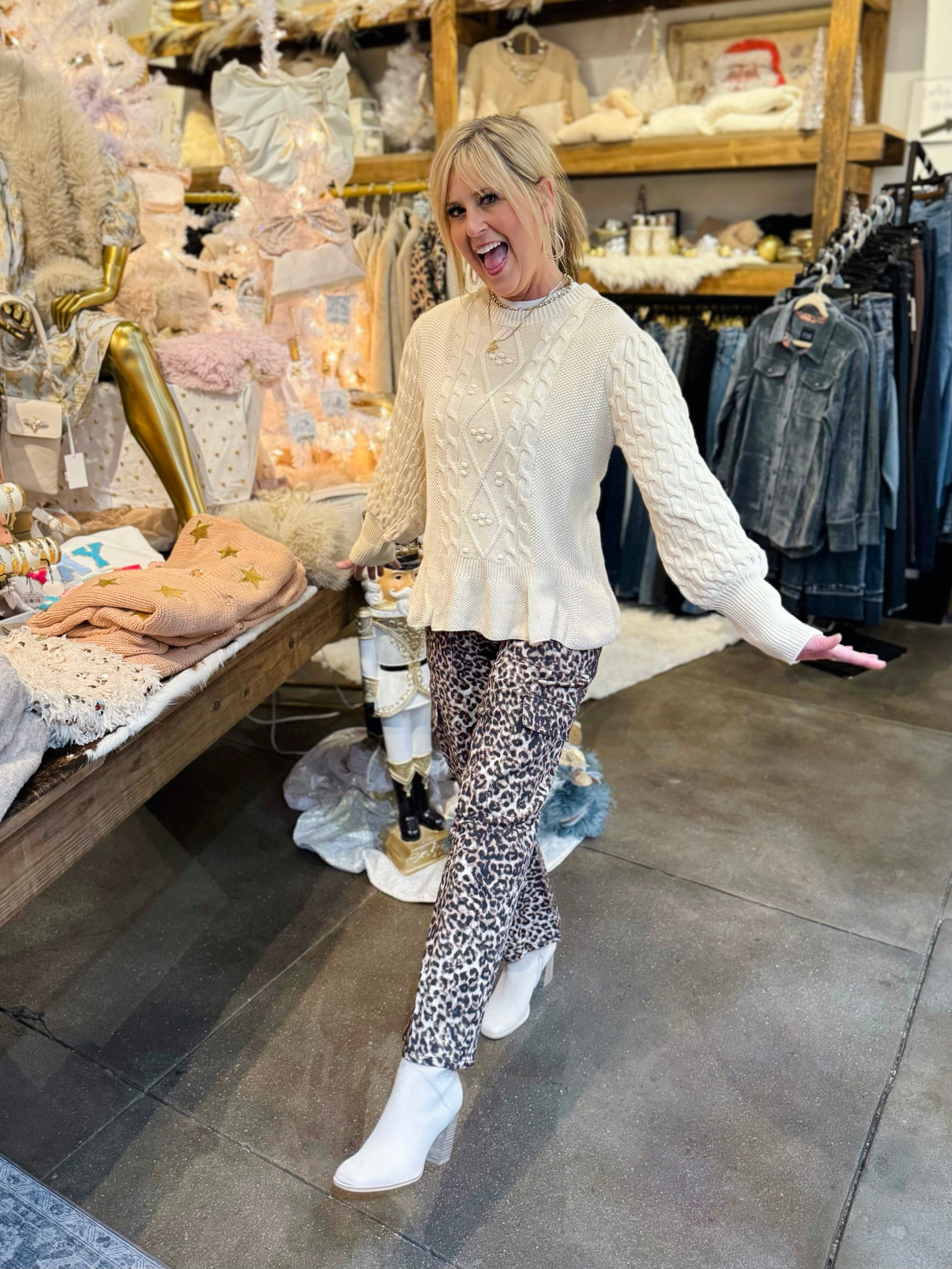 A classic piece featuring a timeless cable knit textured design on a cream colored fabric, with a gorgeous flared hem for a unique addition!