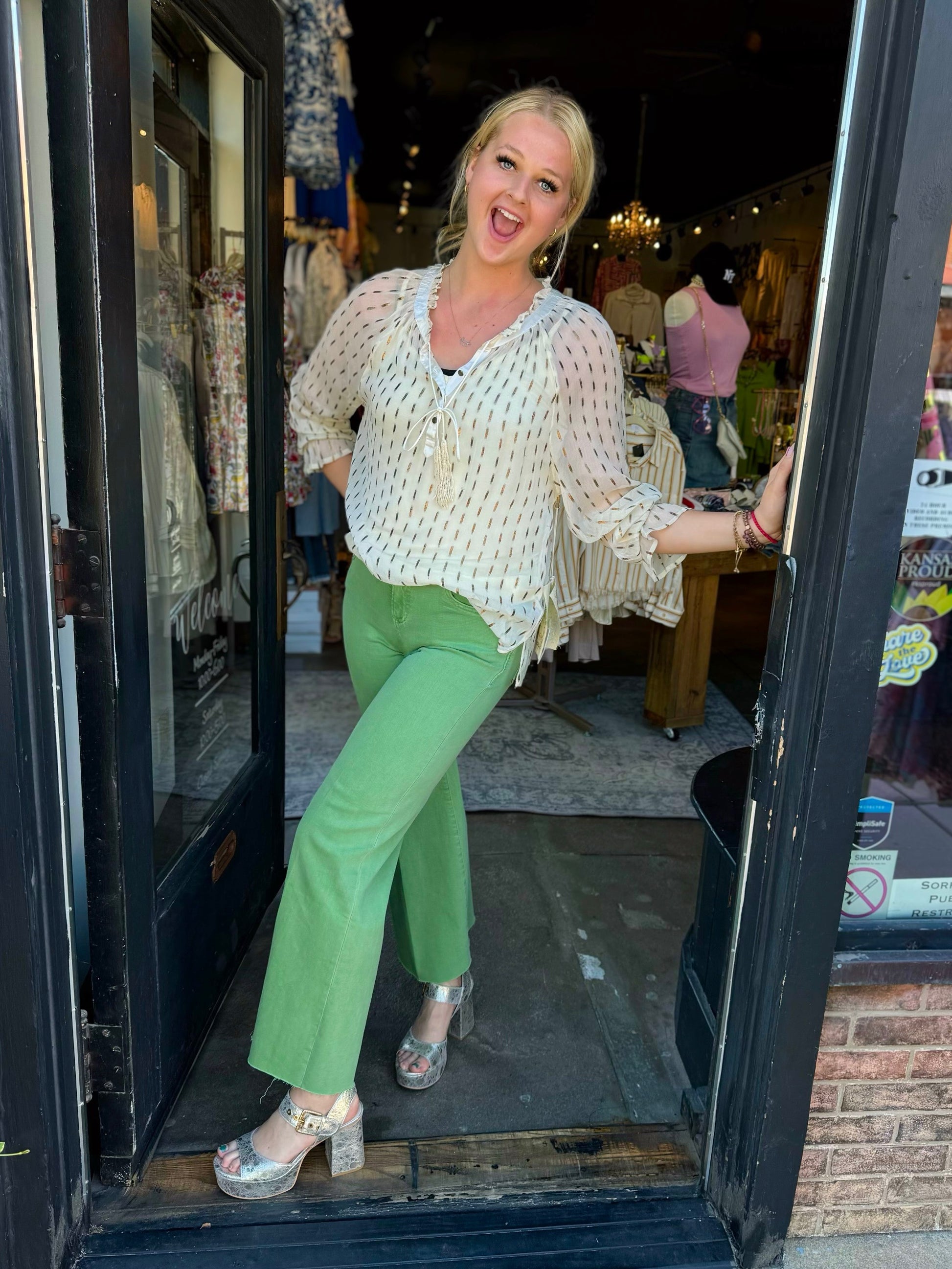 A more simple blouse that still has its uniqueness! Featuring a beaded tassel neck tie, puff sleeves, and a gold metallic dashed-line pattern. This blouse also has a removable lining (knitted camisole top)!