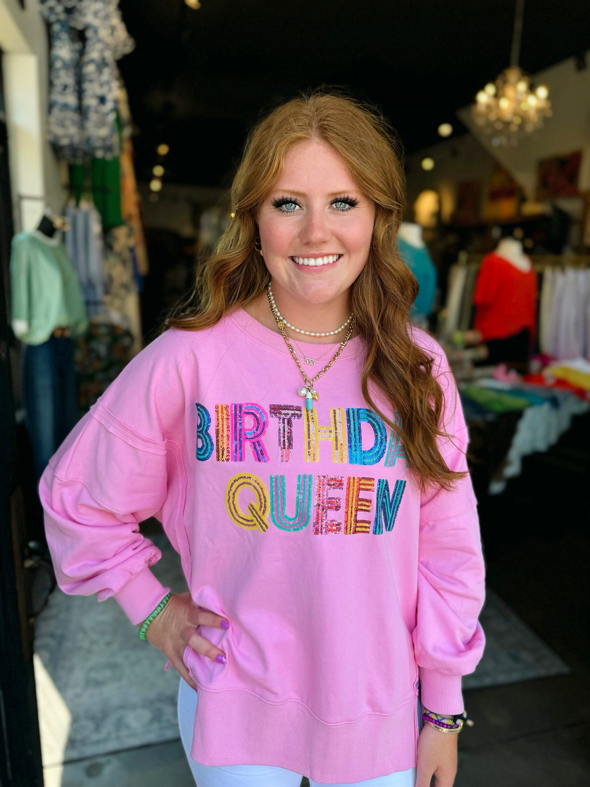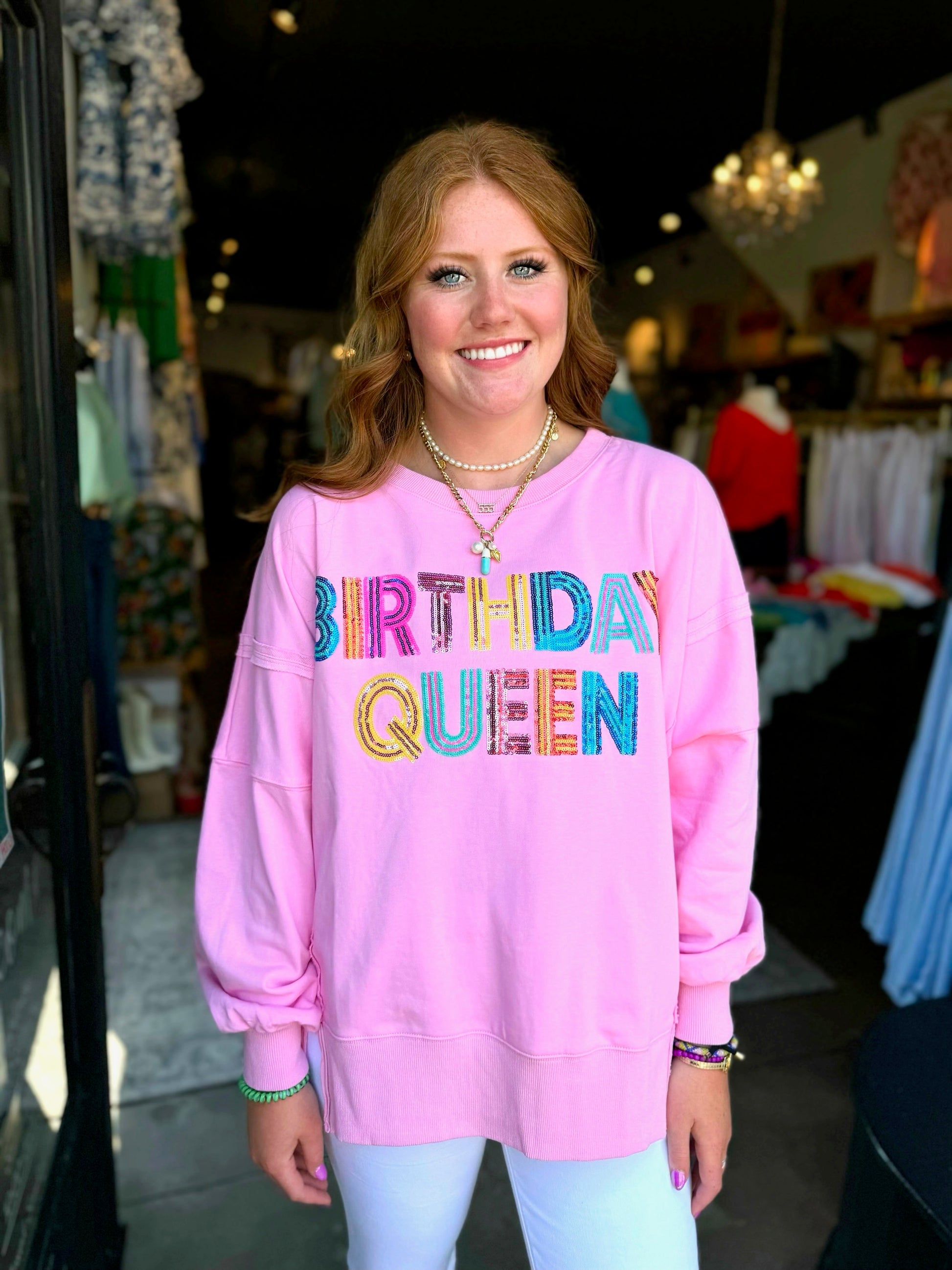 Be the queen on your special day with this oversized, pink sweatshirt featuring multicolor sequin letters. Stay comfy and stylish while celebrating in this fun and unique design!