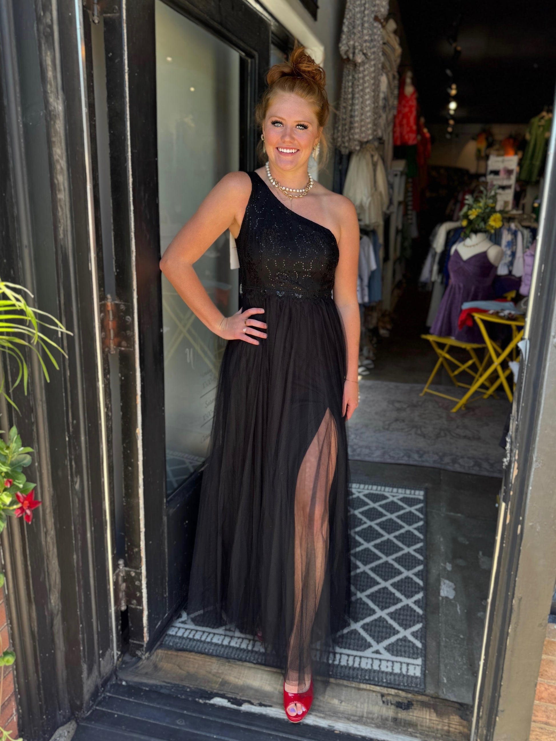Step into elegance with this stunning one-shoulder black gown! Featuring a sequin-detailed bodice, flowing tulle skirt, and a dramatic side slit, it perfectly blends sophistication with allure. A timeless piece that’s sure to make a statement at any special occasion!