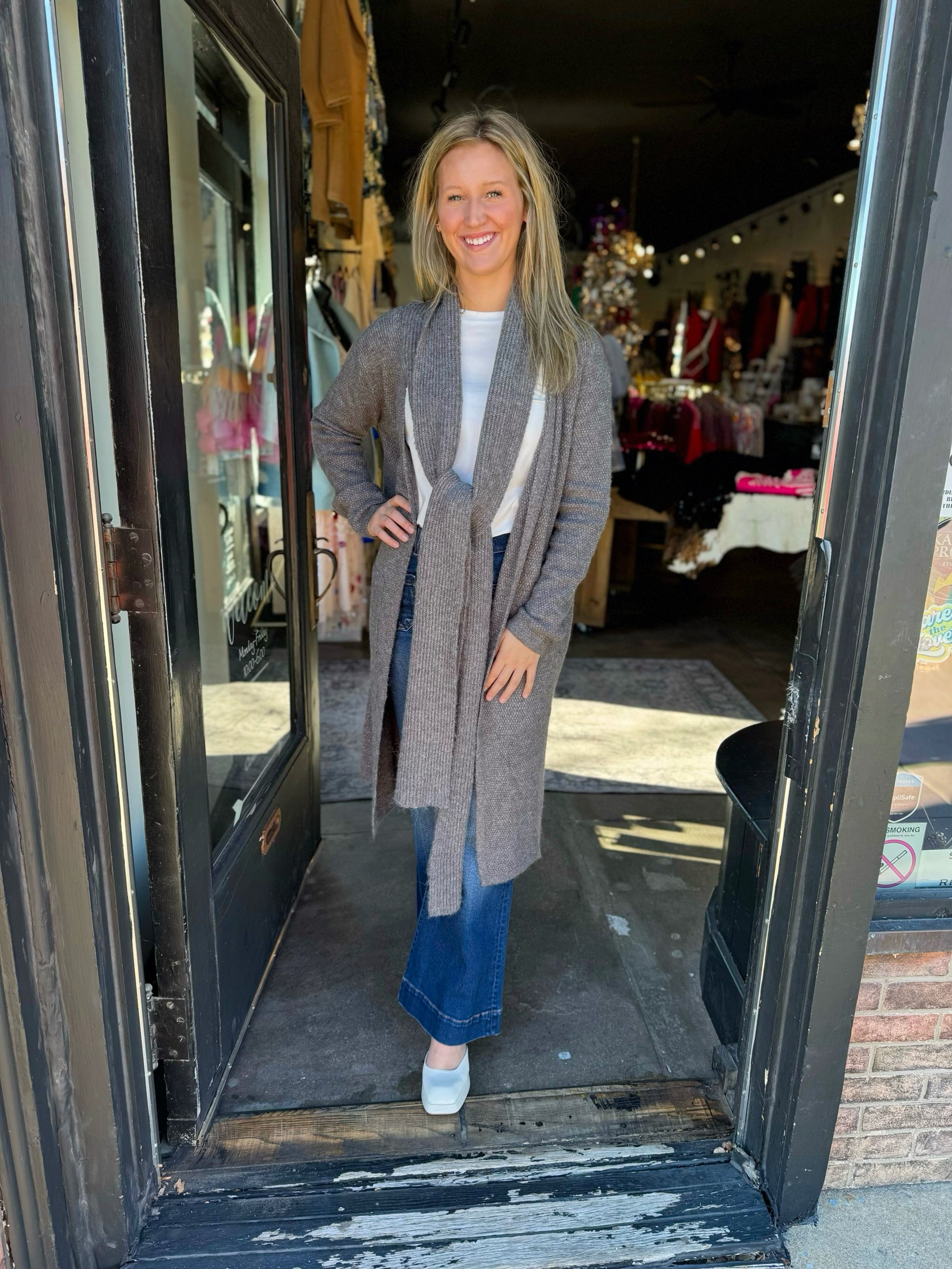 A 2-in-1… A cardigan that also has a built in scarf is a win in our books! Have the option to wear it down with side slits or tie up those two sides however you desire. A comfortable long cardigan that has stretch and features pockets.