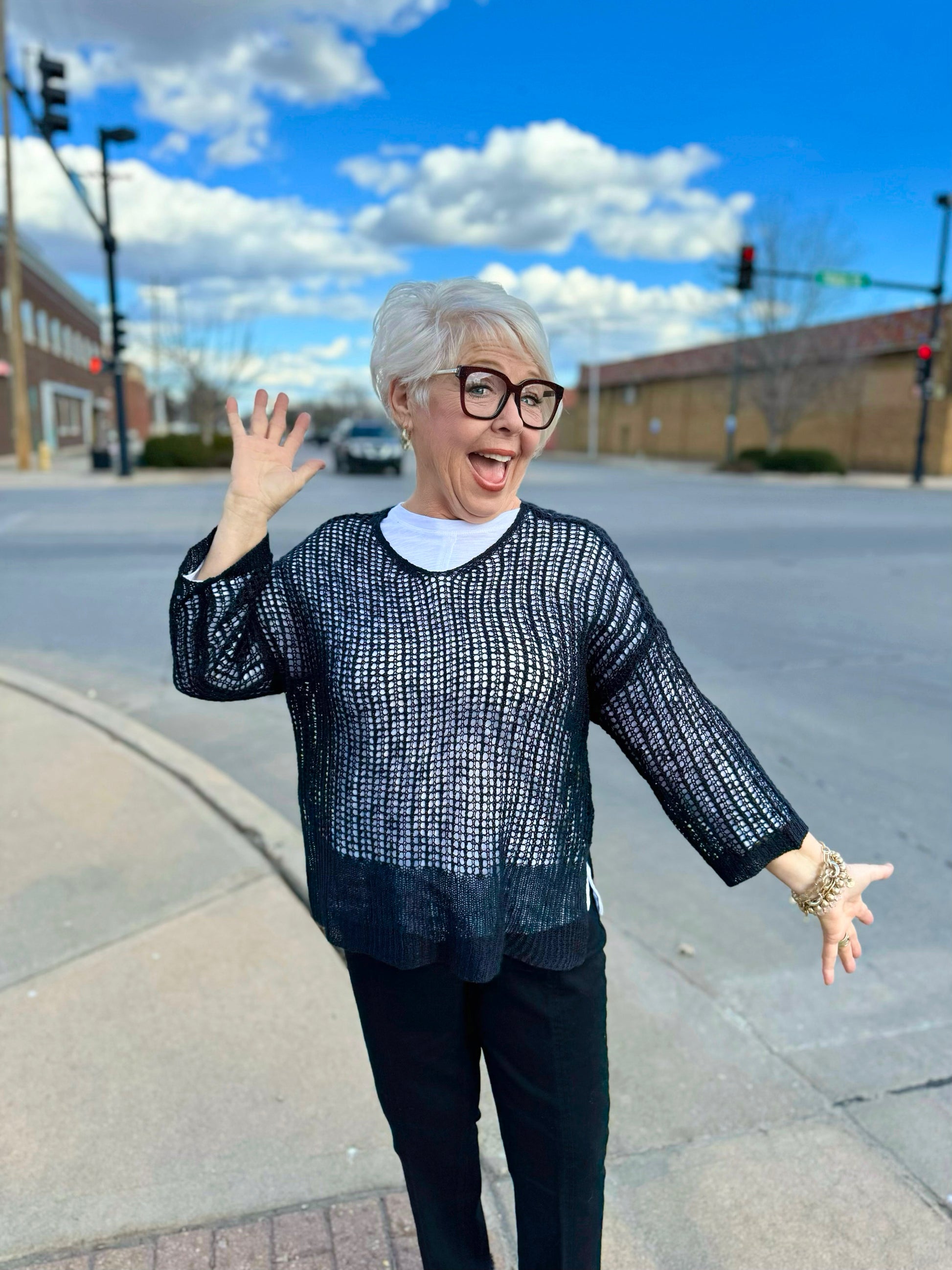Charlie B Black Fishnet Crochet Dolman Top
