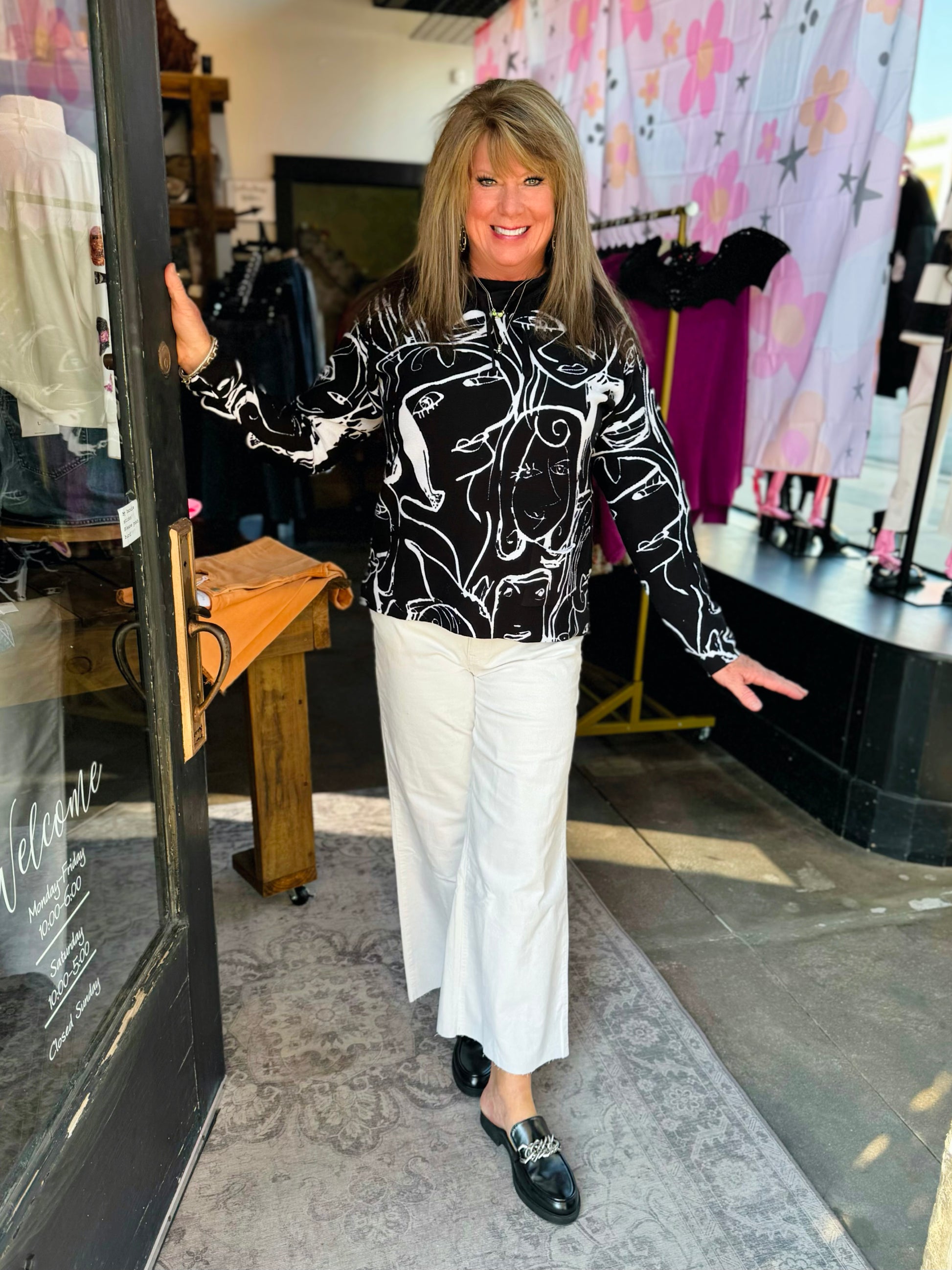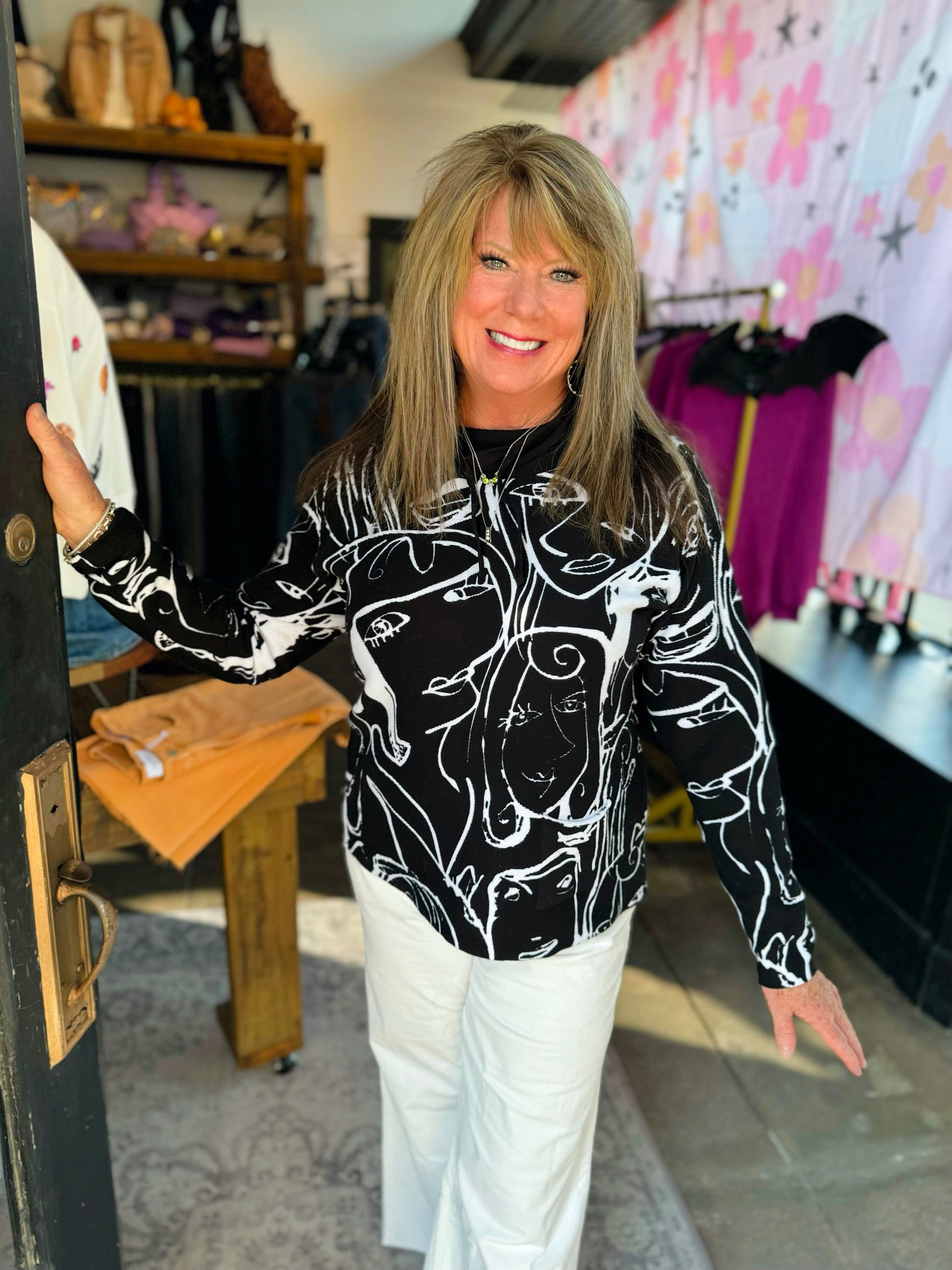 Stunning boldness! This sweater is embellished with a unique abstract face print, a drawstring funnel neck, and a pocket detail! So eye-catching!