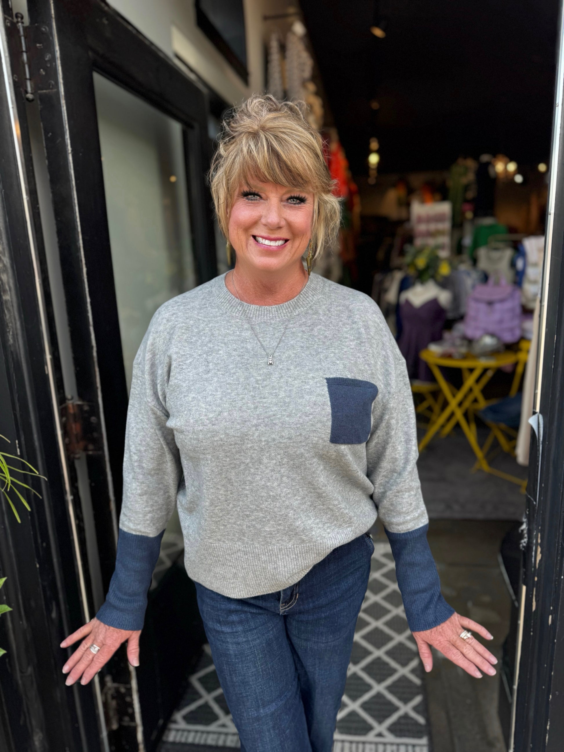 This cozy gray sweater features navy contrast details on the pocket and cuffs for a modern twist! With its relaxed fit and soft knit, it’s the perfect blend of comfort and style for everyday wear!