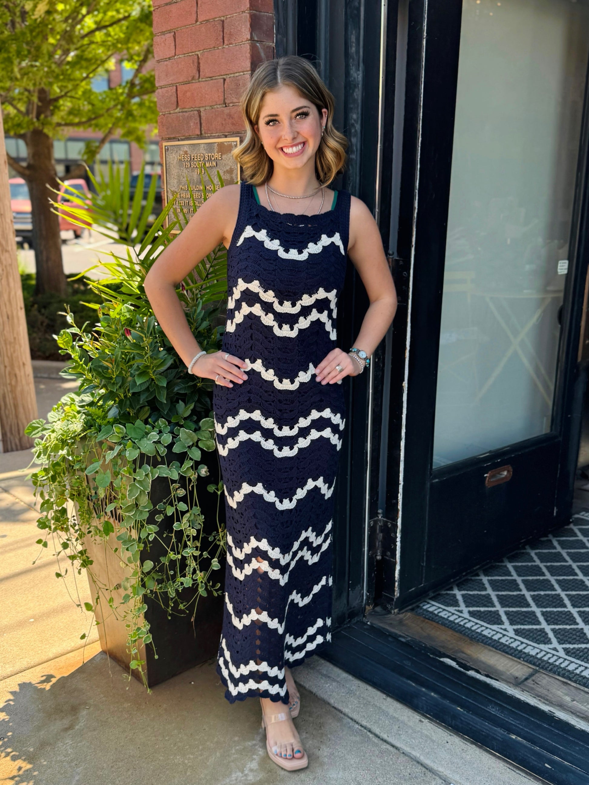 Make a statement in this navy crochet maxi dress featuring bold cream wave stripes and a sleeveless silhouette. The intricate open-knit design adds texture and charm, while the straight-cut fit offers effortless elegance. Finished with scalloped edges and a breezy feel, it’s a standout piece with timeless appeal!