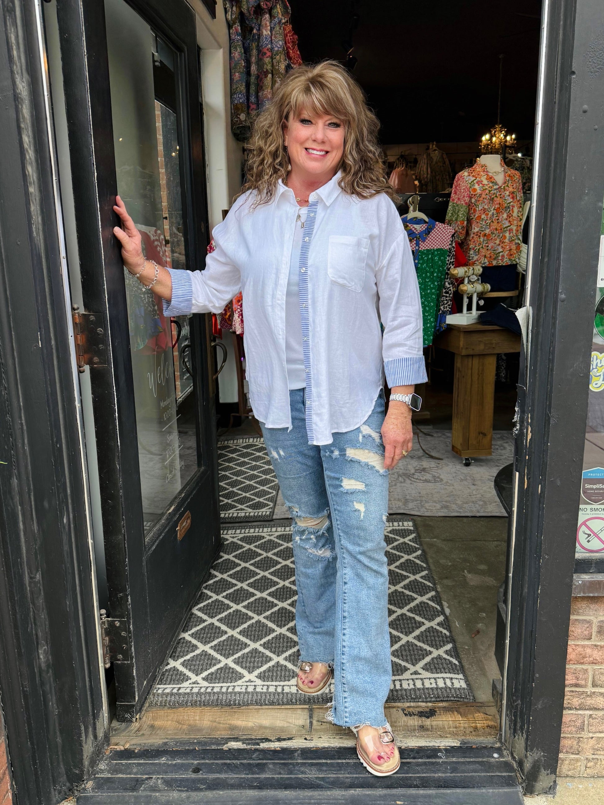 Stay effortlessly polished with this crisp white button-up shirt! Designed with a relaxed fit, a front pocket, and subtle striped trim along the placket and cuffs, it’s a versatile staple perfect for layering or wearing on its own!