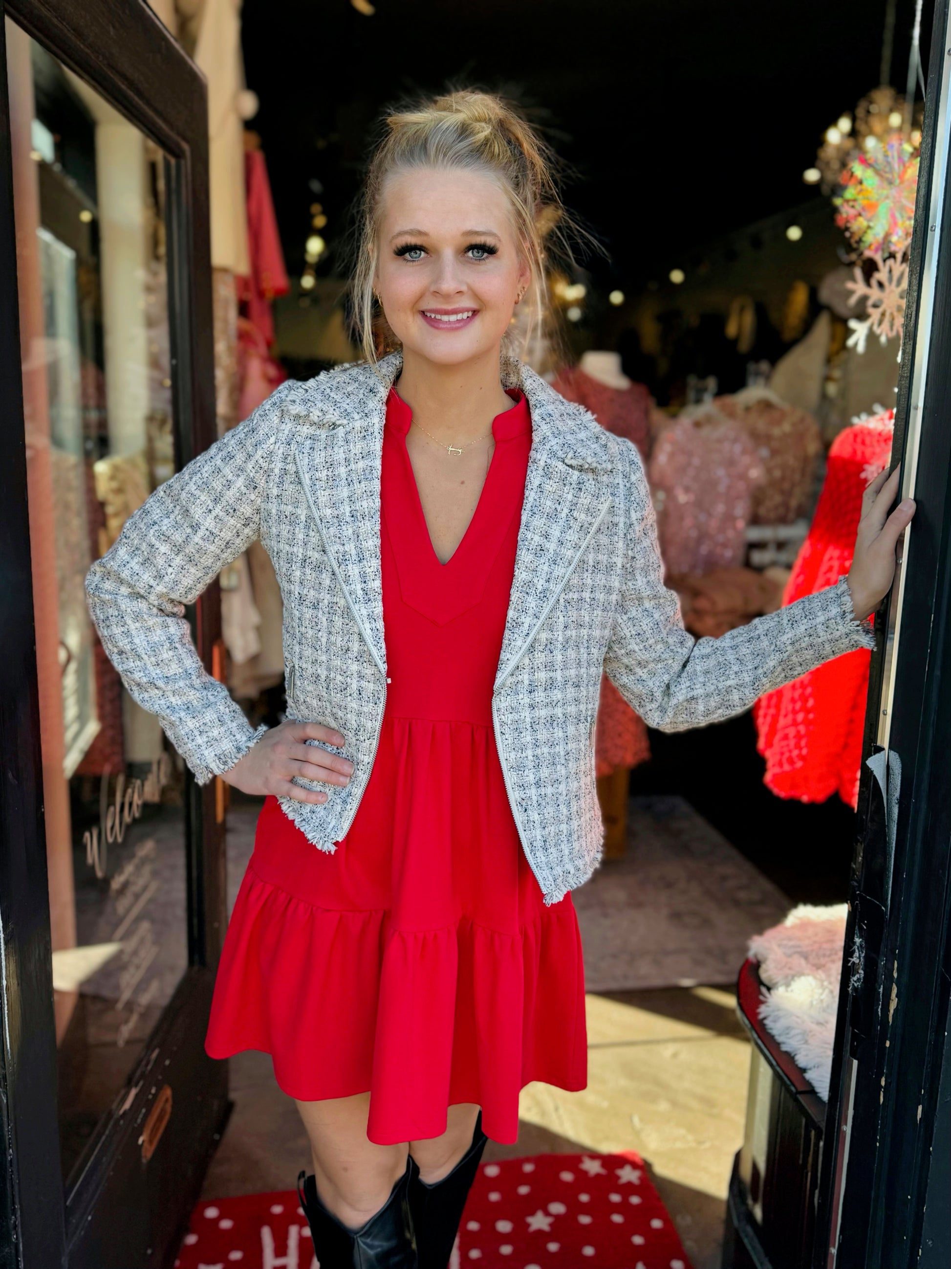 This adorable jacket features elegant tweed material, a classic style collar, frayed edge he, hook-and-eye closure and side pockets. Dress it up or down!