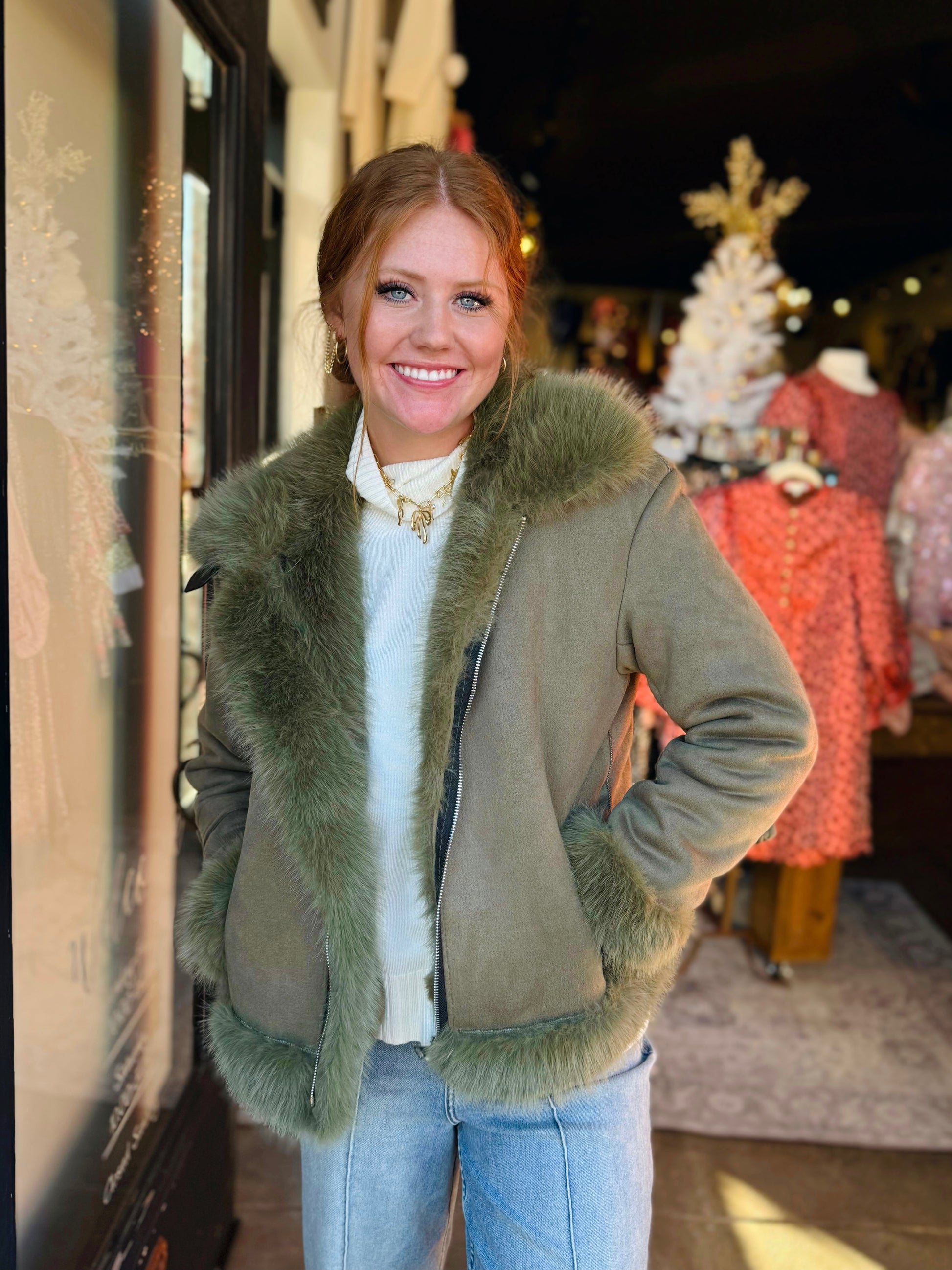 Make a fierce statement in this faux fur Moto jacket! Designed with a zip front, pockets, and luxurious faux fur trim, you’ll be sure to turn heads!
