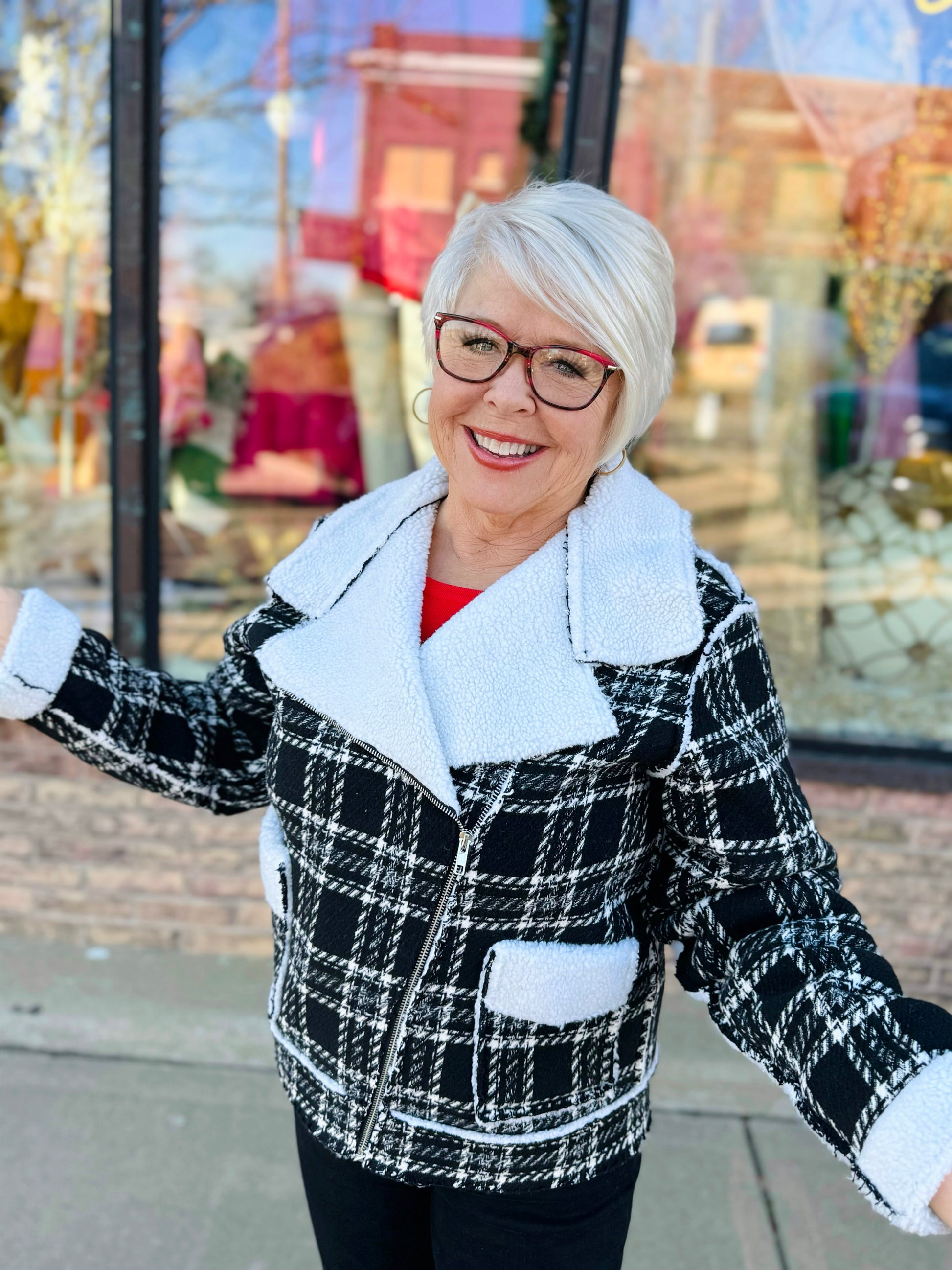 This stylish zipper front collared jacket is perfect for adding a chic layer to any outfit. It features a classic black and white plaid design and relaxed fit. A go-to choice for an effortless look!