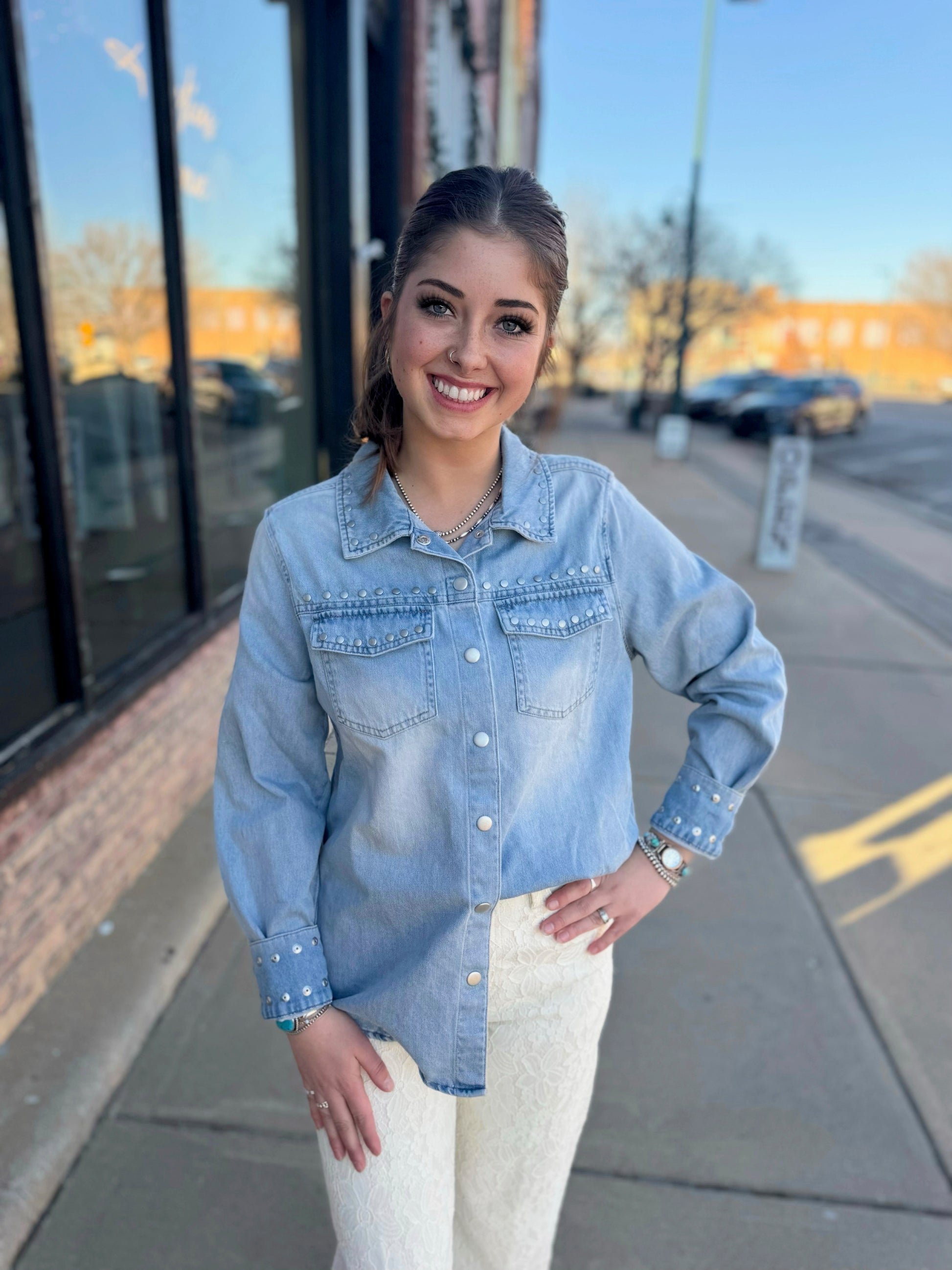 A lightweight chambray top featuring a classic collar, snap-button front, and subtle stud detailing along the chest pockets and cuffs. Finished with a relaxed fit and soft denim wash for an elevated everyday staple!