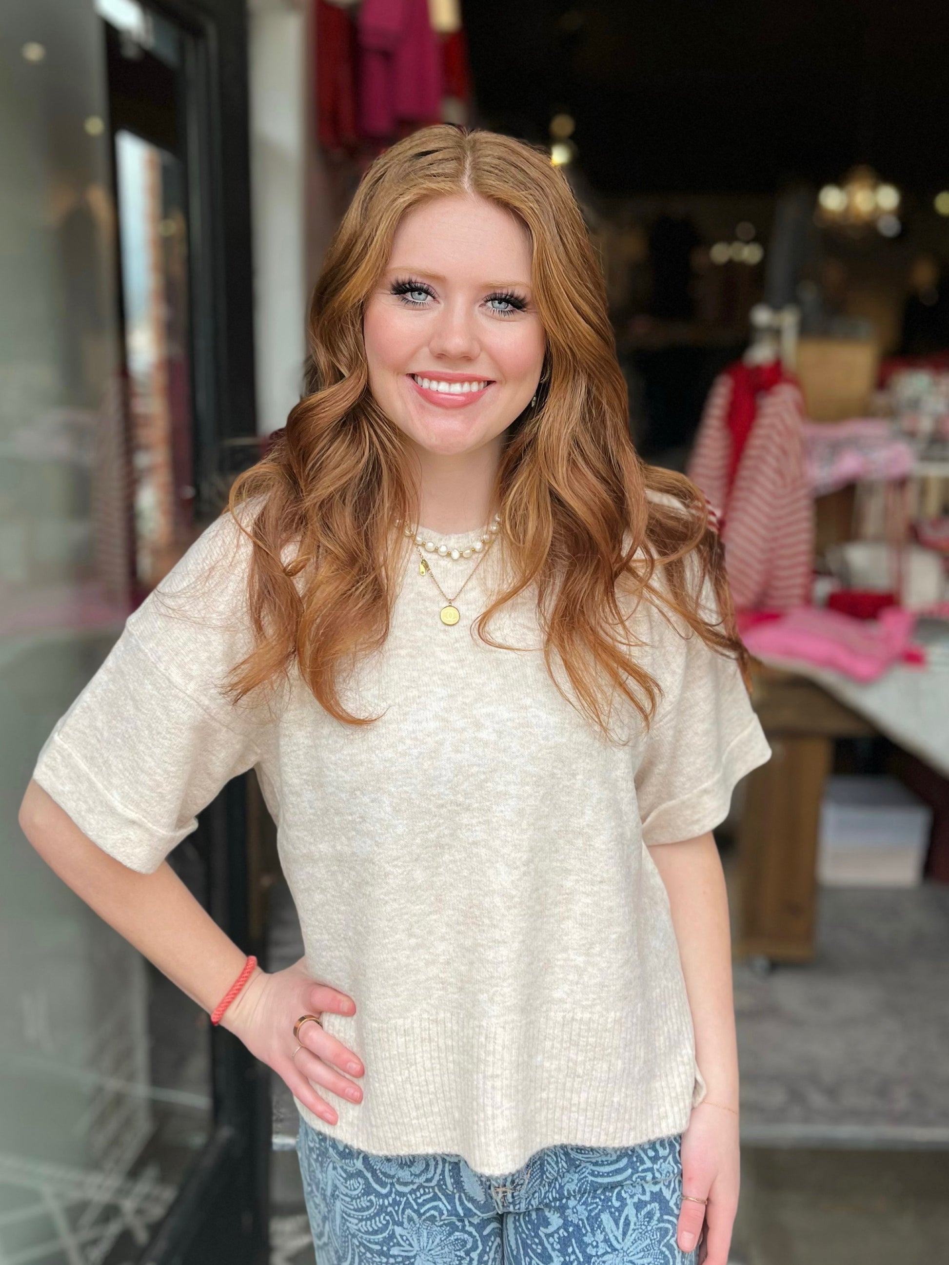 Soft oatmeal knit top featuring a relaxed silhouette, short sleeves, and subtle ribbed detailing at the hem for an easy, elevated everyday look!