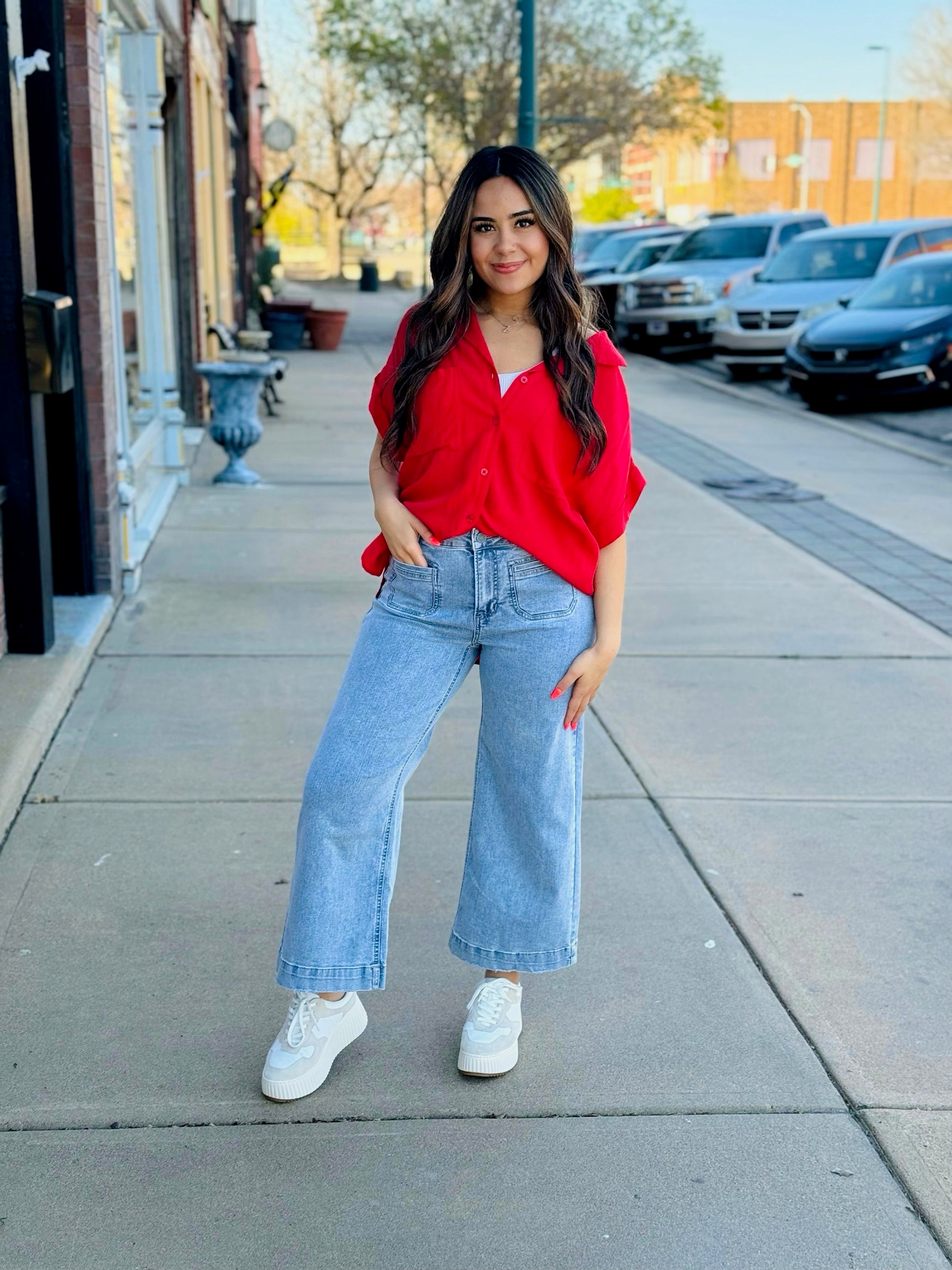 Tie front shirt with lapel & collar, drop shoulder button front finished wide cuff band, center back seam, high side vents, self blocked front pocket. Ever comfy & versatile, complimentary form for any lifestyle!