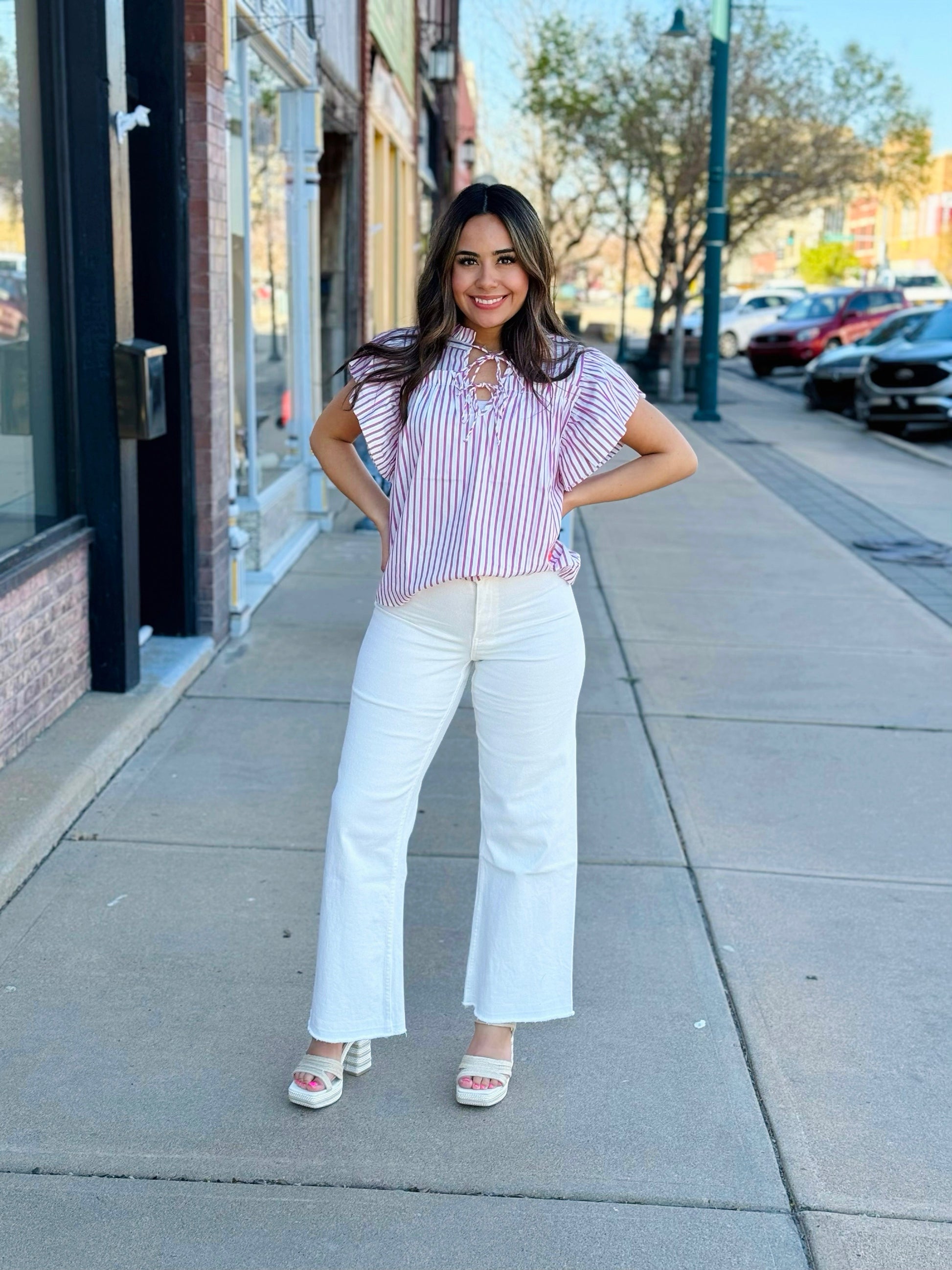 Timeless refinement of stripes, infused classic charm for polished appeal! Multi ruffles top at neck & seams, open front v-neck with double self ties finished with petal sleeve.
