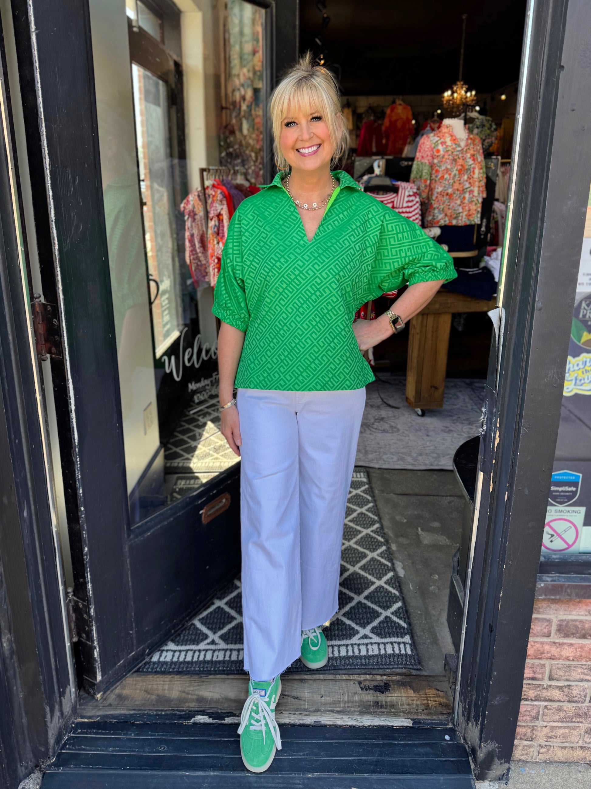 Add a pop of playful flair to your wardrobe with this bright green patterned top! Featuring a bold geometric print, a zip-up collared neckline, and a relaxed, easy fit, this top is perfect for effortless styling with jeans, shorts, or your favorite pants!