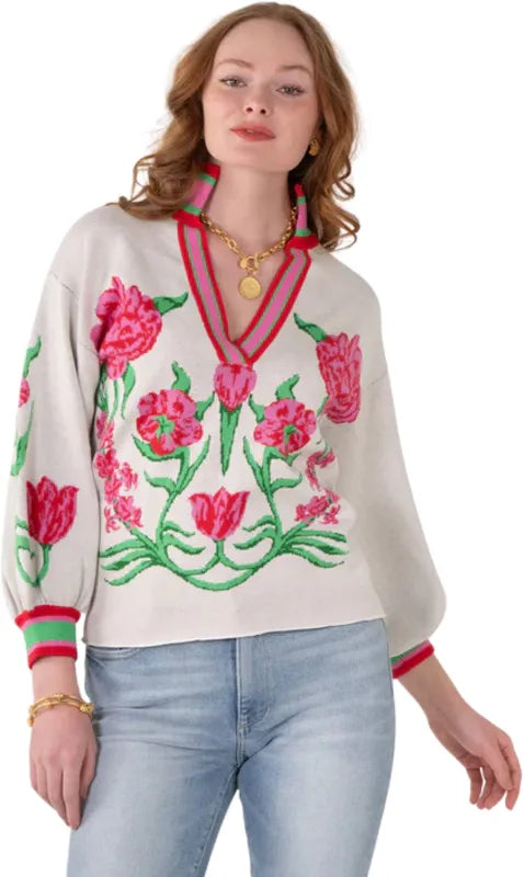 The Lolli Sweater Garden Cheetah seamlessly blends fierce energy with feminine charm. Crafted from a lightweight yet substantial viscose knit fabric, it offers both comfort and a refined drape. The slightly tailored fit ensures a flattering silhouette, while the classic stand collar and blouson sleeves add a touch of sophisticated drama. A delicate array of dainty florals merge together, creating the subtle yet striking illusion of a cheetah's face. This unexpected twist transforms a classic knit into a statement piece, a wearable work of art that sparks conversation and intrigue.