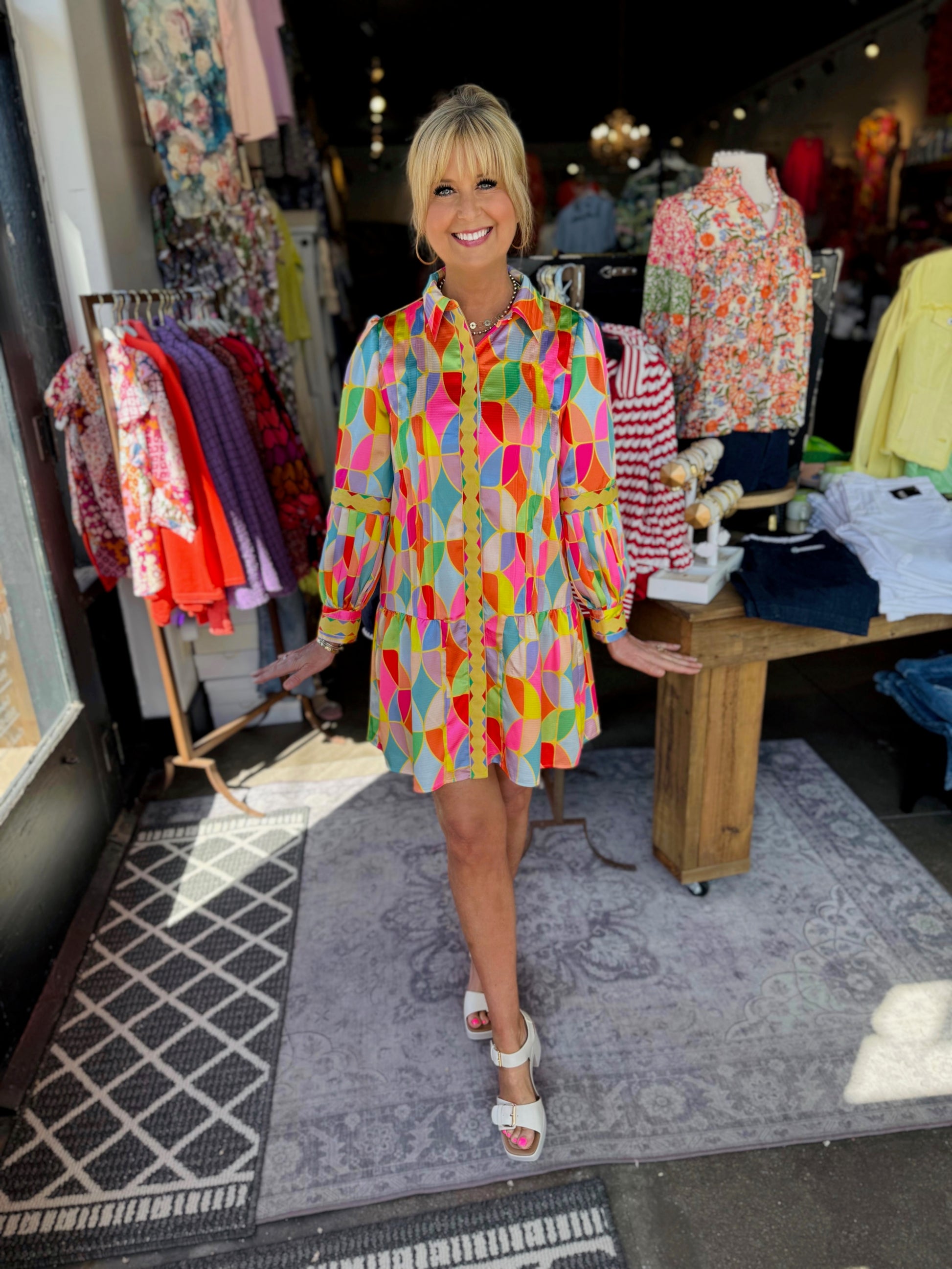 Bright, bold, and full of personality, this geometric print mini dress is a true showstopper. Featuring a playful mix of vibrant colors and a structured collar with button-down detail, this dress brings a retro flair to modern style. The long, puffed sleeves add a touch of drama, while the flowy fit keeps it comfortable and fun—perfect for parties, brunch, or any day you want to stand out.