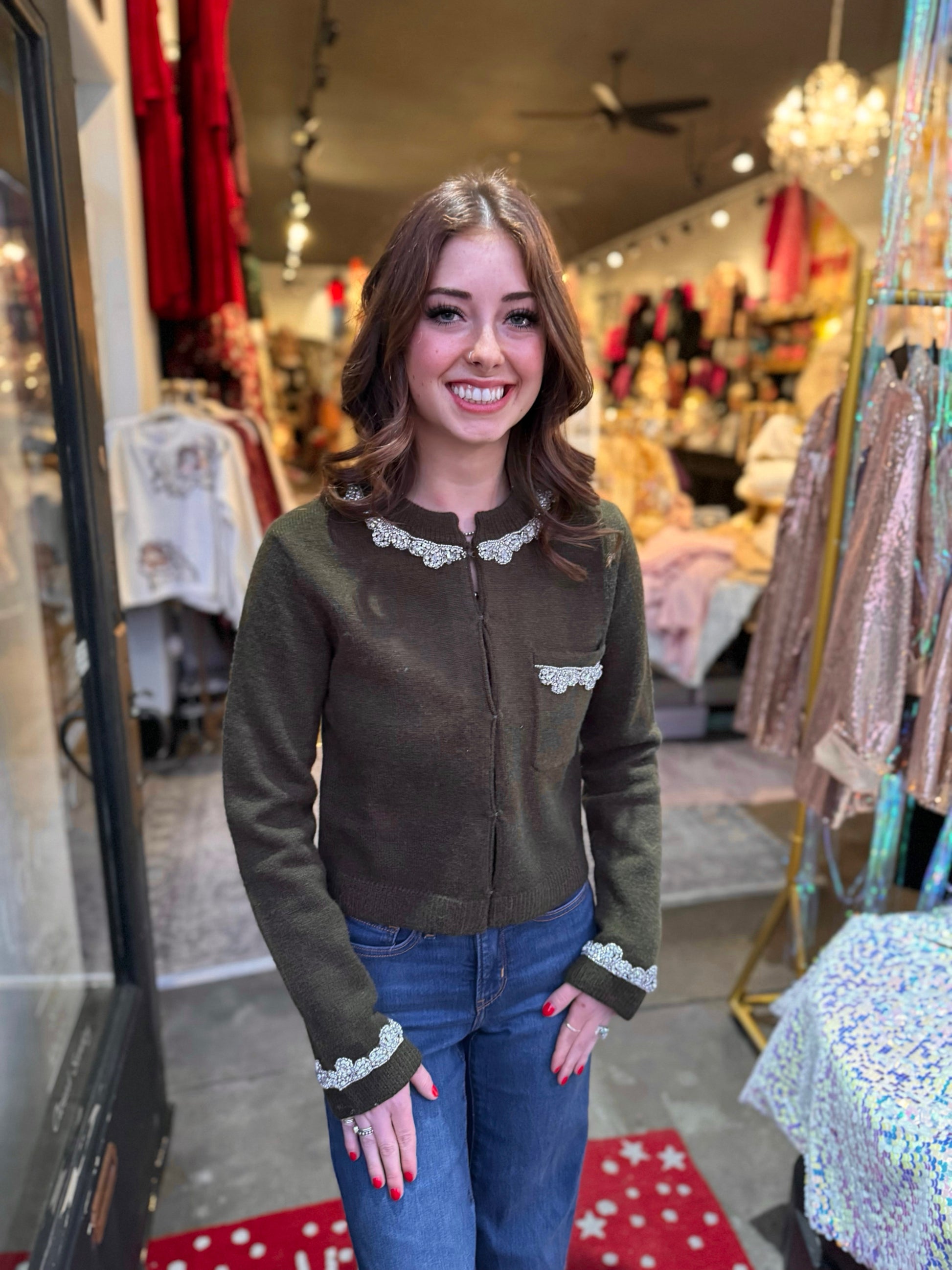 A classic olive cardigan featuring delicate scalloped trim with subtle sparkle along the neckline, cuffs, and pocket detail, finished with a polished button-front silhouette!