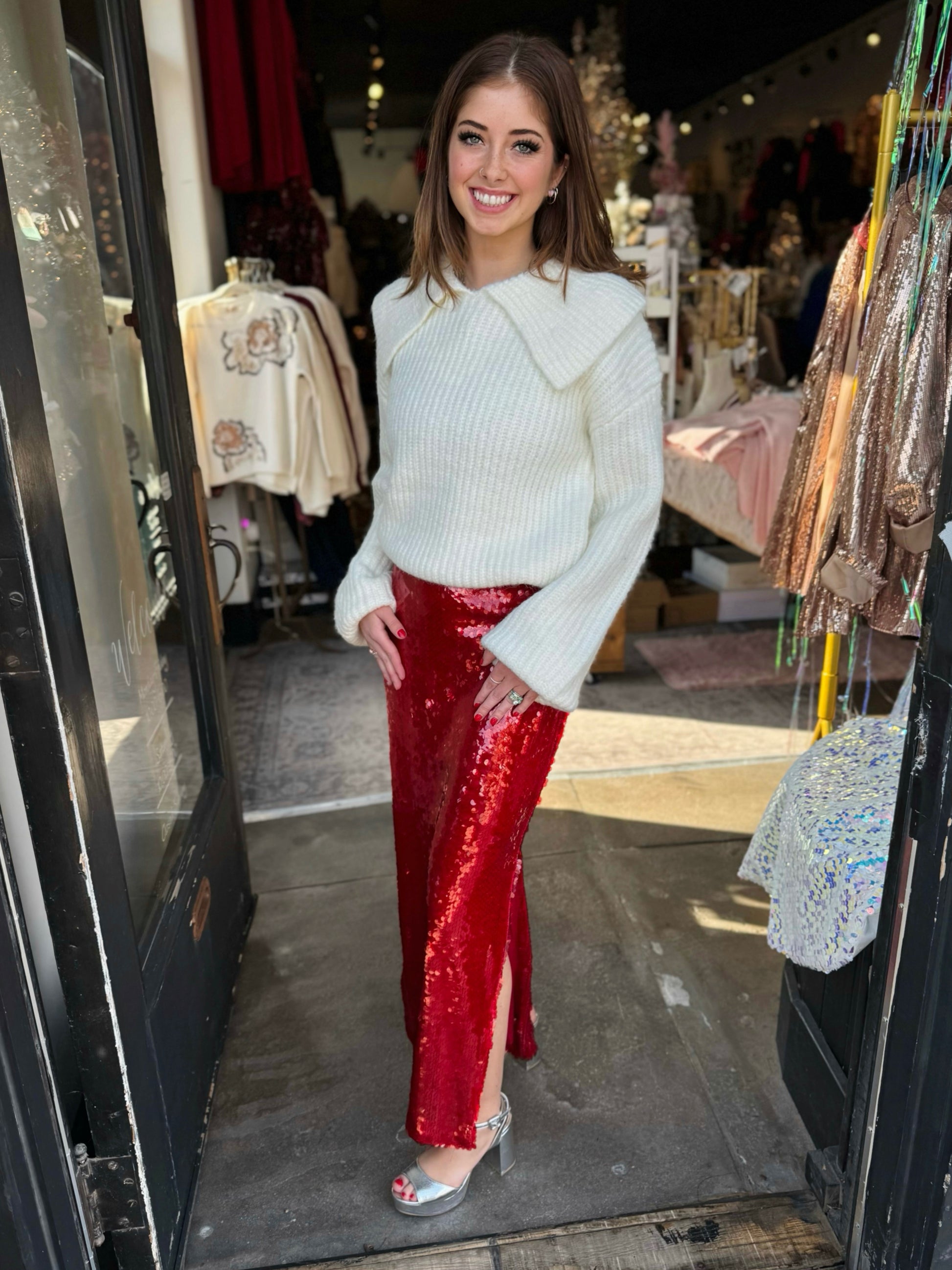 This ivory sweater combines both style and comfort, featuring a soft, luxurious-feel material, a large fold collar, bell sleeves, and a classic fitting silhouette for an easy everyday staple to dress up or down!