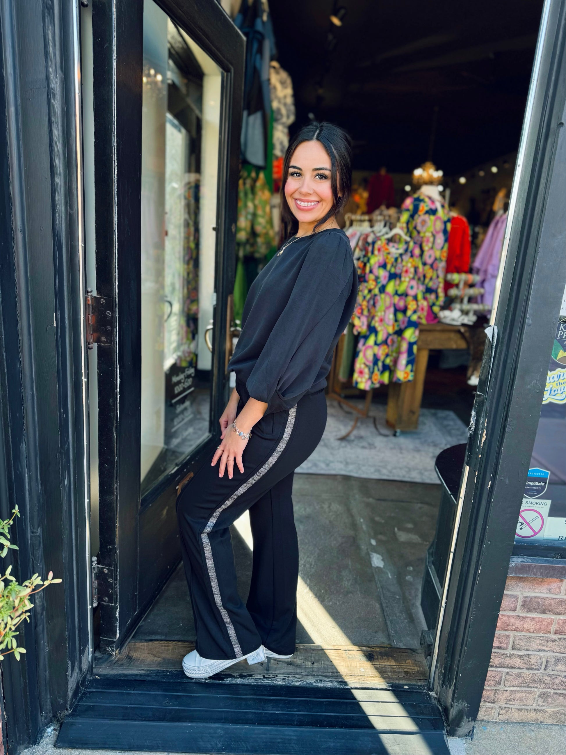 This comfortable jogger has a beautiful stitched pleated seam on the front and a lurex band on both sides.