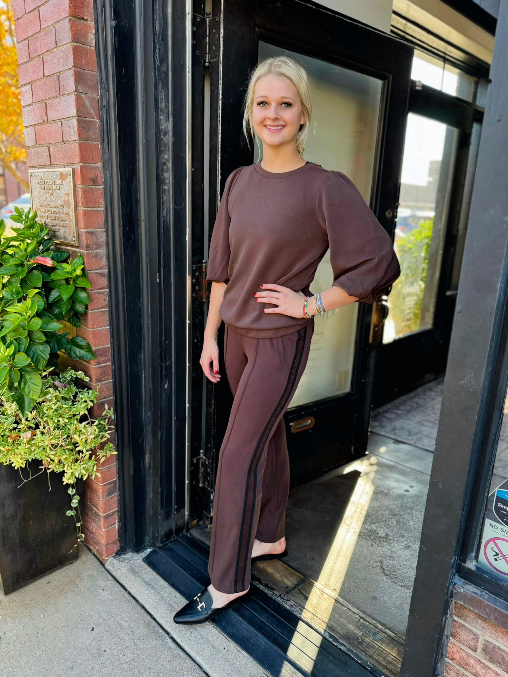 This comfortable jogger has a beautiful stitched pleated seam on the front and a lurex band on both sides. In trendy espresso brown