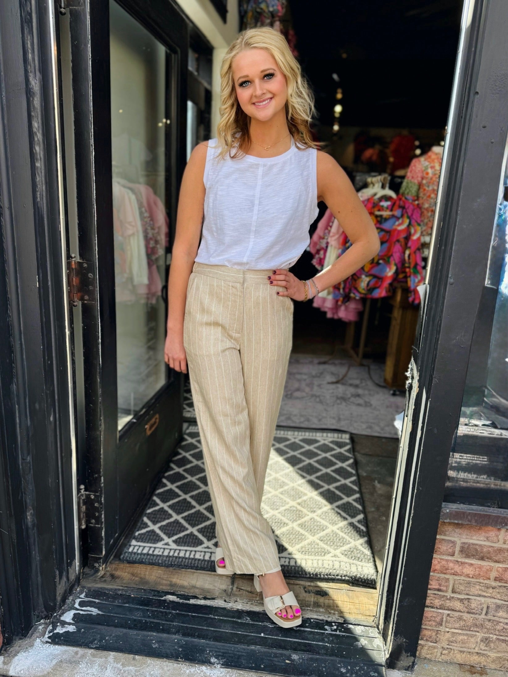 Embrace an effortless summer style in these linen stripe trousers in a gorgeous sand hue. Elegant and versatile, these stylish pants will keep you cool and classy!