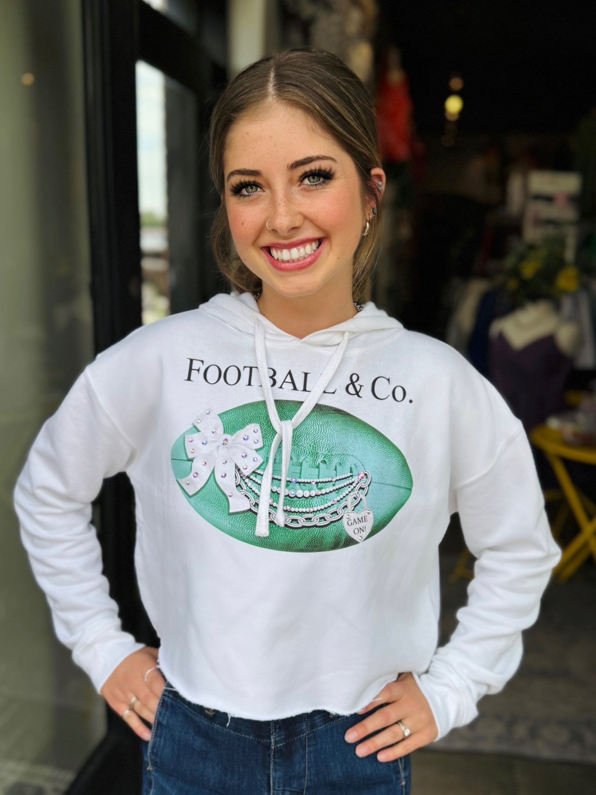 This playful cropped hoodie in crisp white features a chic football graphic embellished with pearls, chains, and a rhinestone-studded bow. Finished with a raw hem and drawstring hood, it’s the perfect blend of sporty and stylish for game day or casual wear!