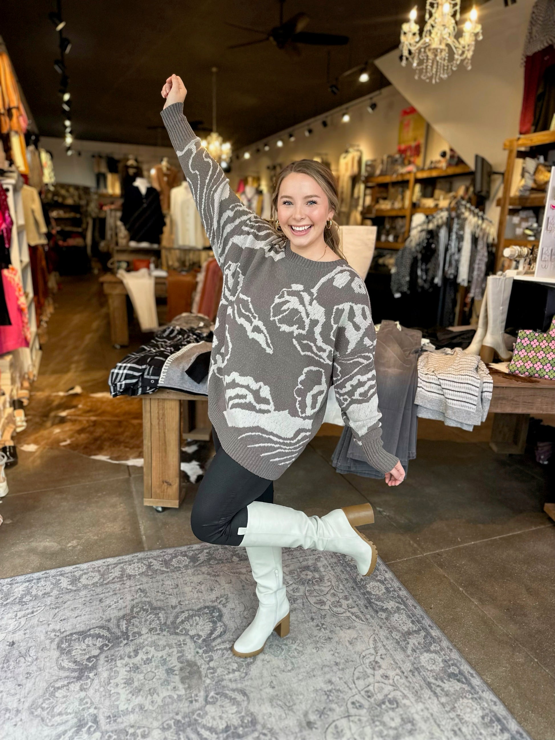 Wear your floral prints into fall with this charcoal/silver sweater. This sweater is soft, comfortable, and oversized. Style with leggings, jeans, slacks, anything!