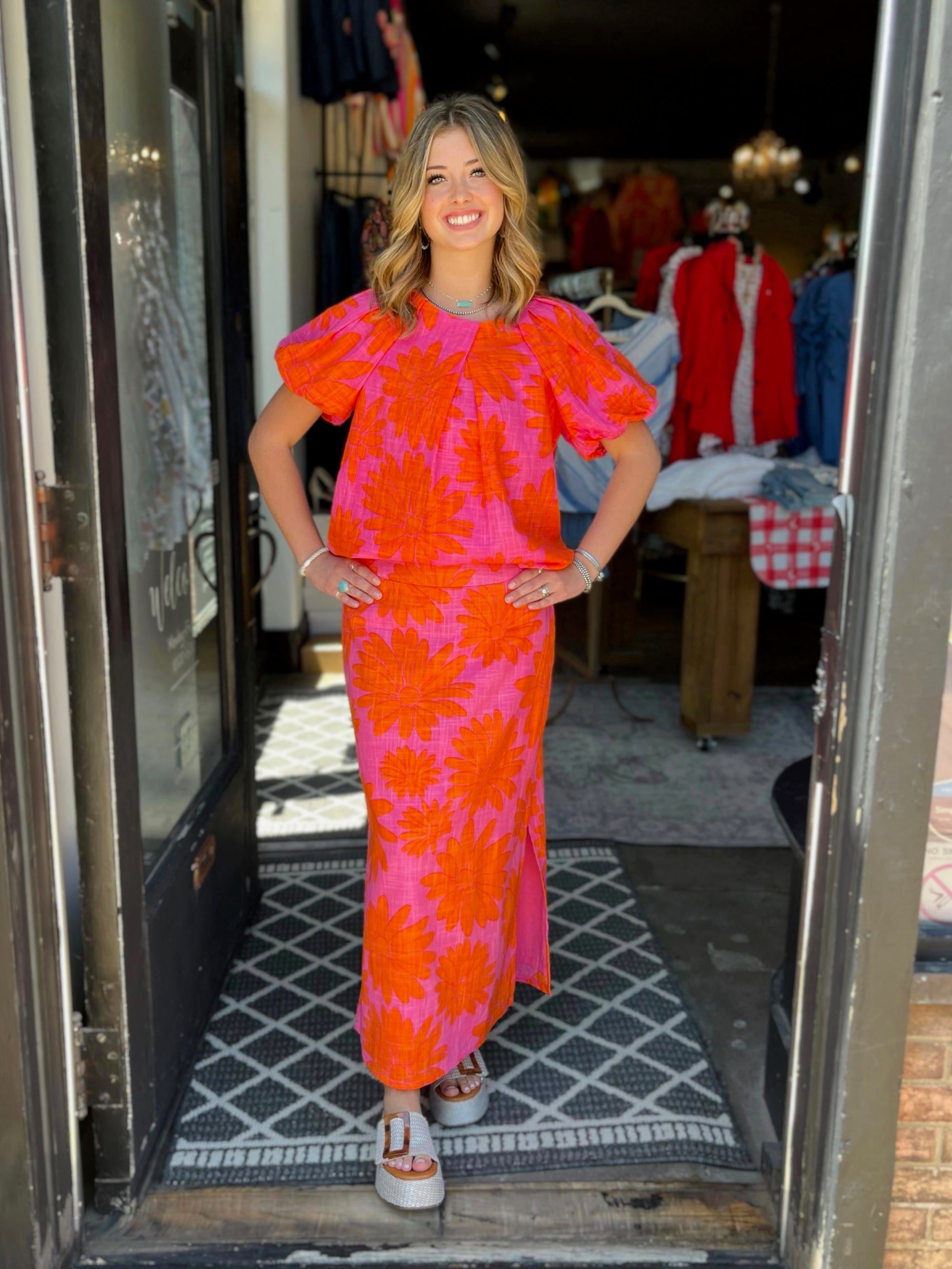 This eye-catching maxi skirt features vibrant orange floral prints on a bold pink backdrop, with a flattering straight silhouette and a side slit for easy movement. Pair it with the matching top or style it solo for a standout summer look!