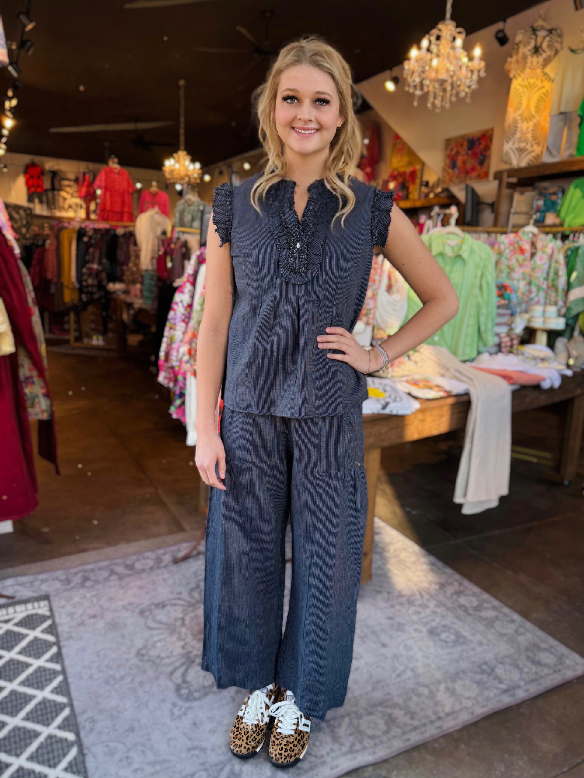Elevate your style with Ivy Jane's Striped Wide Leg Pants. The navy/white pinstripe adds a touch of sophistication, while the elastic waistband ensures a comfortable fit!