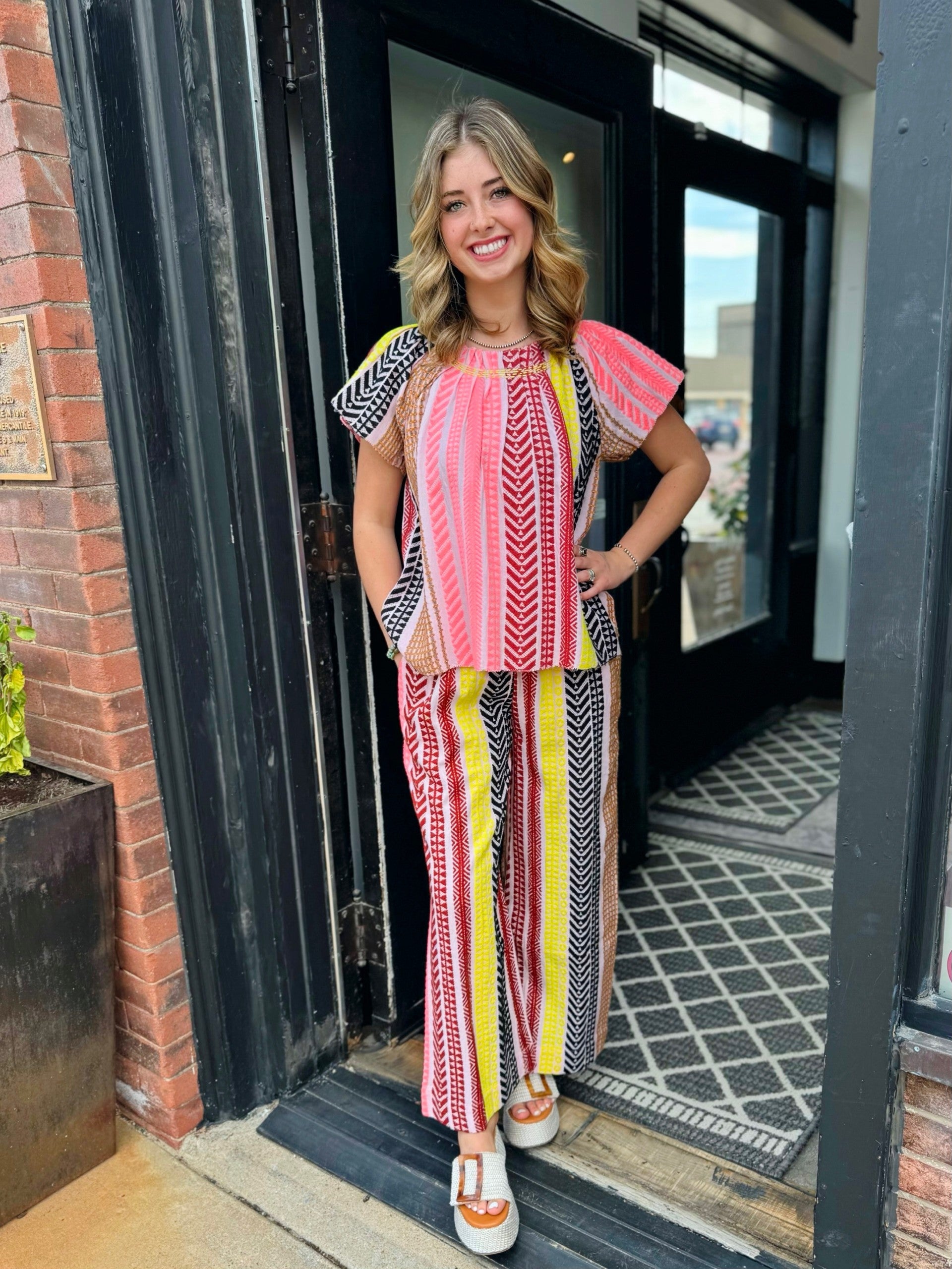 Make a bold statement with these vibrant wide-leg pants! Featuring a colorful mix of chevron stripes in red, yellow and black and white, these breezy bottoms bring a playful energy to any look!