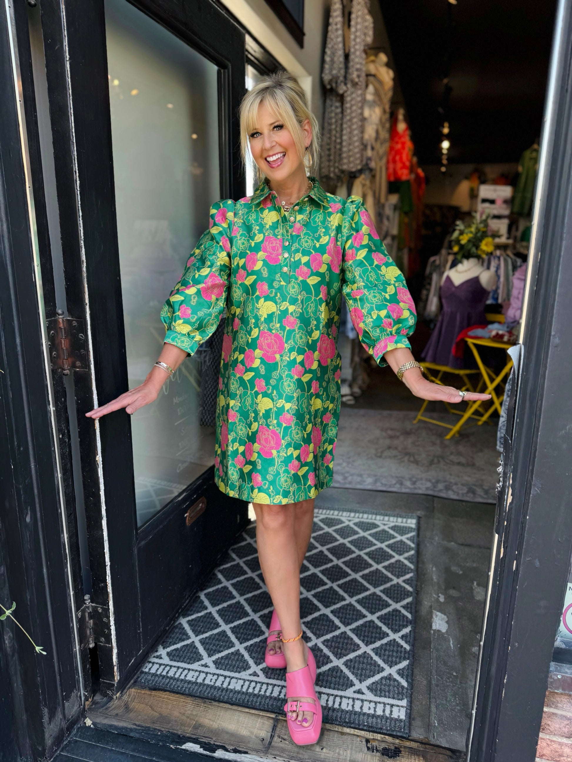 This bold and playful dress features a vibrant green base adorned with bright pink rose and gold accents. Designed with a classic collar, puff sleeves, and a straight silhouette, it’s a statement piece that effortlessly blends vintage charm with modern flair!