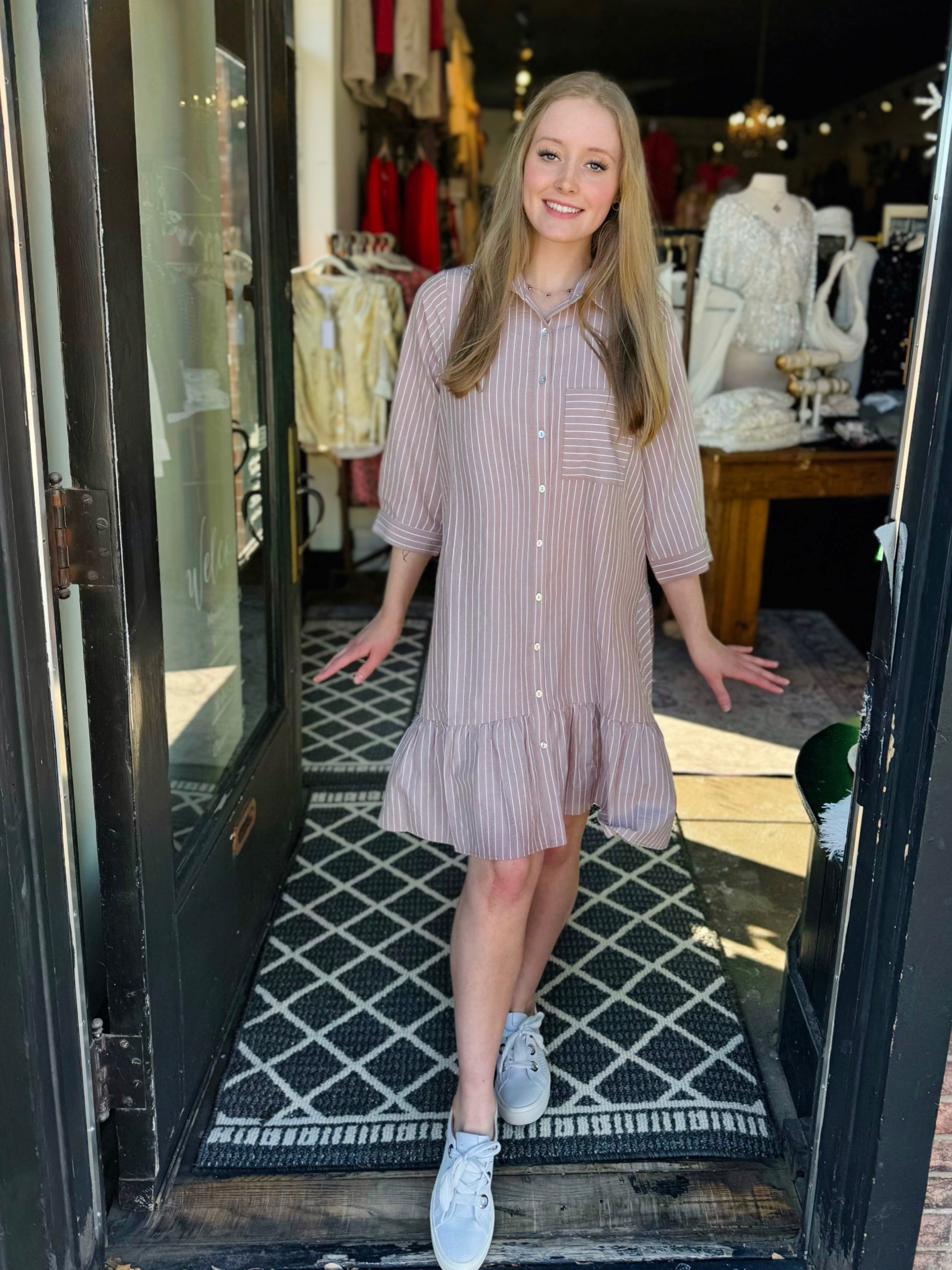Trendy and sophisticated, this cotton stripe dress is knee length, with a button up design, front chest pocket, and trendy 3/4 sleeves!
