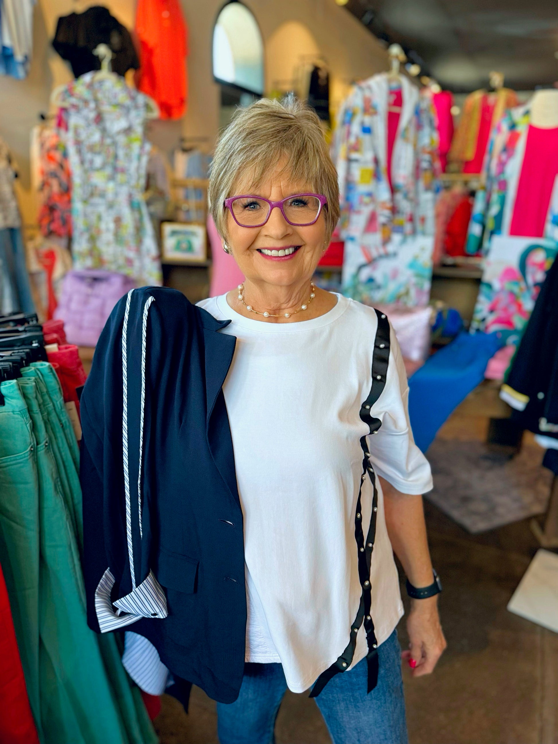 The Rebecca top! Made with high quality pointe knit & the side mixed with light weight woven parachute-like fabric. The front adds a touch of uniqueness with the ribbon and baby pearls. This top features a round neck, short sleeves, front pocket, and an easy relax fit. Perfect everyday wear!