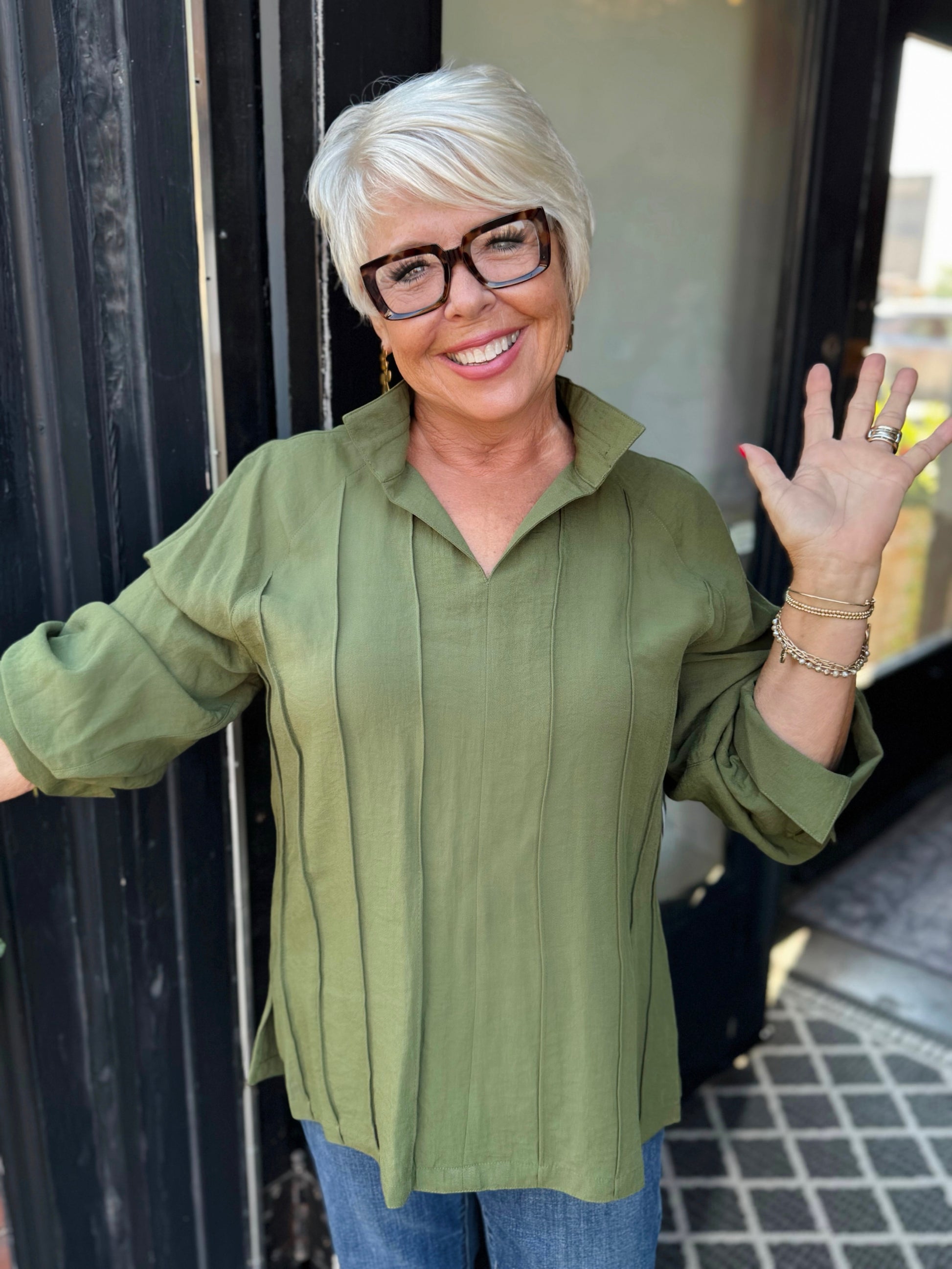 Jon Mark DK Olive Split Nk Wire Collar Top W/Pintuck Details & 3/4 Slvs