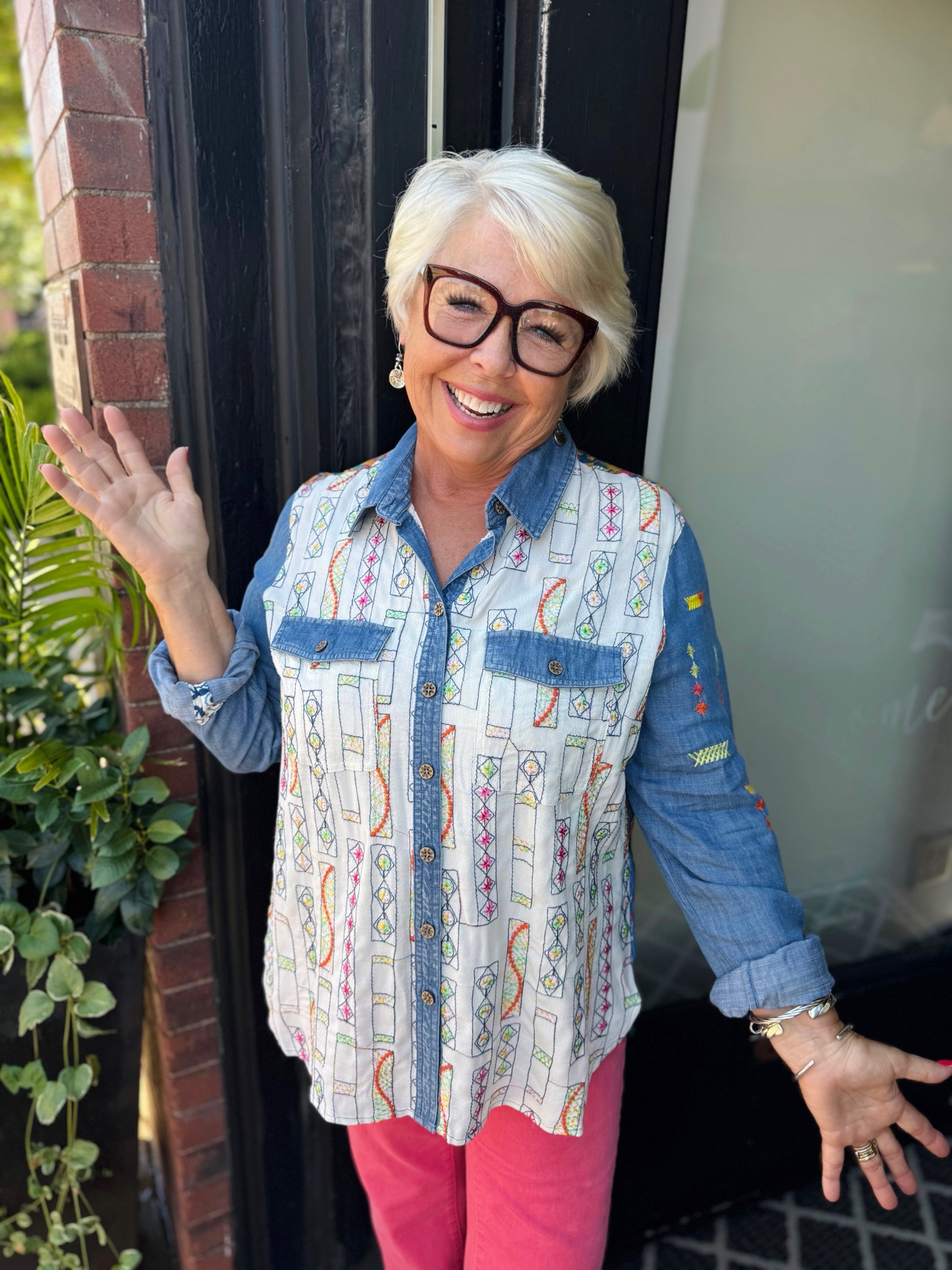 This playful button-down features colorful geometric embroidery across the front and sleeves, blending classic denim with a burst of vibrant detail. Finished with chest pockets, wood-style buttons, and rolled cuffs, it’s a relaxed piece full of charm and personality!