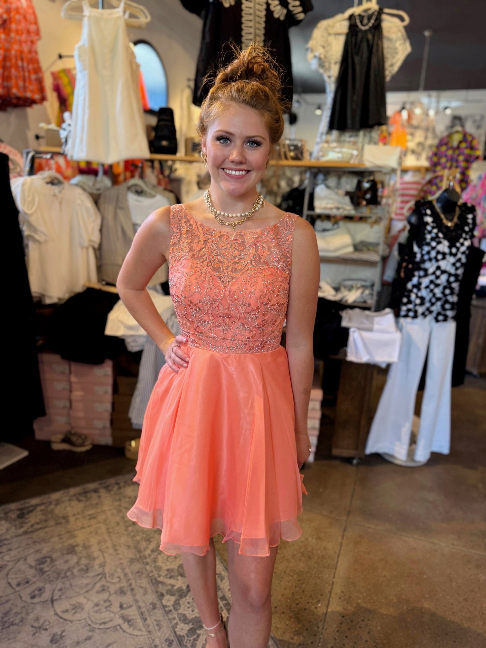 Bring on the charm in this radiant coral mini dress featuring a glittering beaded bodice, illusion neckline, and a flowy chiffon skirt that twirls with every step! A satin waistband adds the perfect finishing touch to this dreamy look!