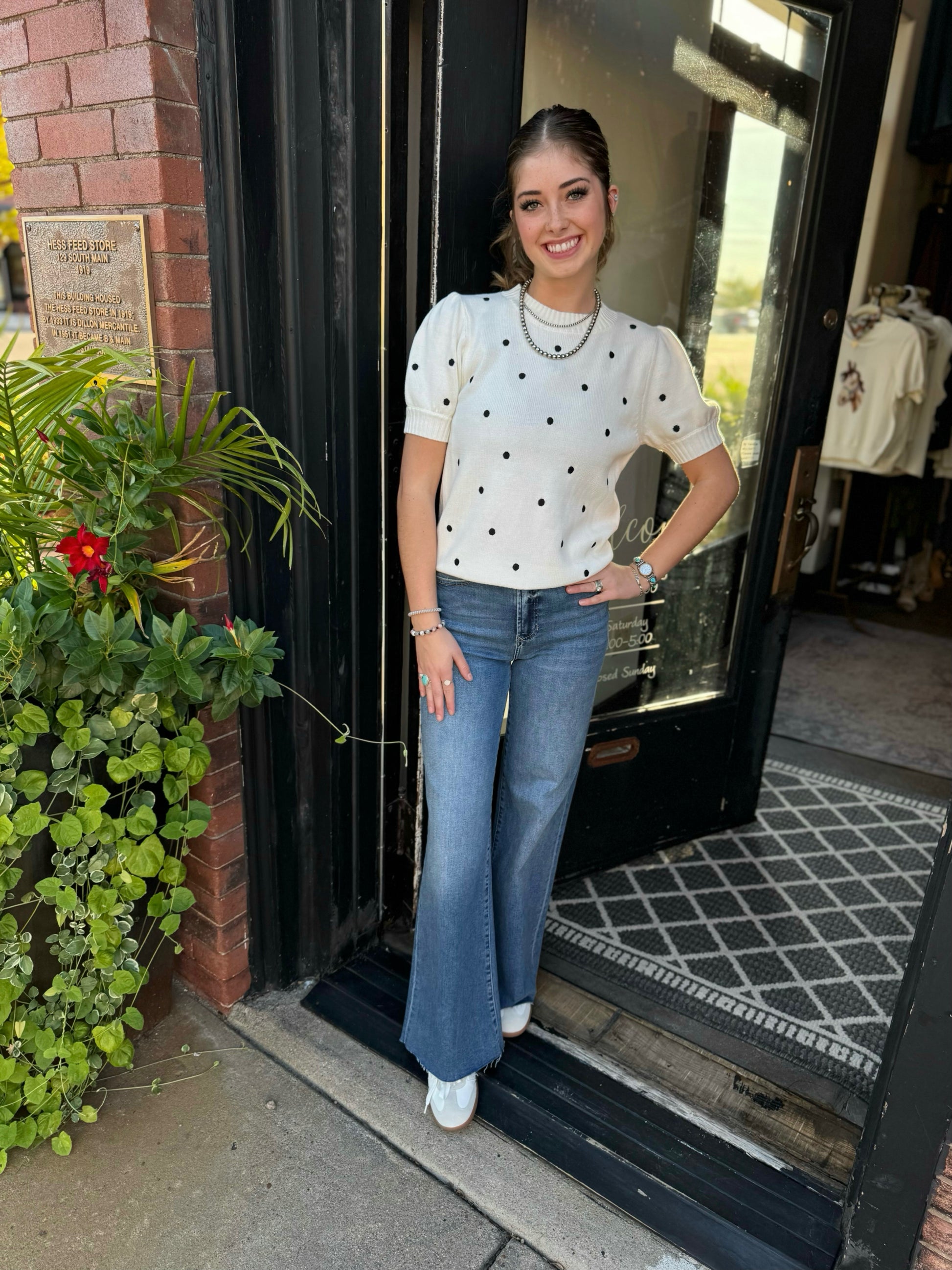 This ivory knit top is a chic and timeless piece that adds a touch of polish to any outfit! Featuring playful black polka dots, short puff sleeves, and a flattering fitted silhouette, the soft, lightweight fabric makes it perfect for transitioning between seasons!
