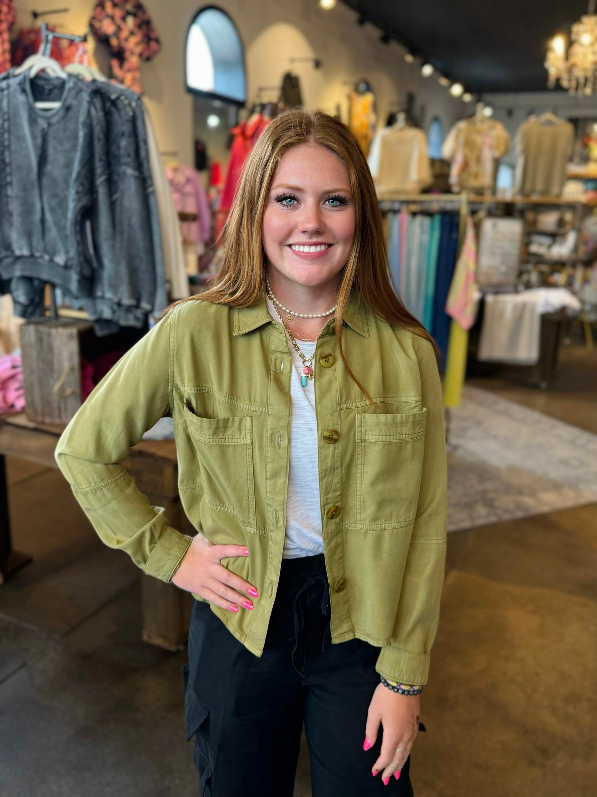 Make a statement with this bold green layering piece, perfect for those chilly fall days ahead! This jacket features utilitarian style pockets, a button down closure, and stylish collar.