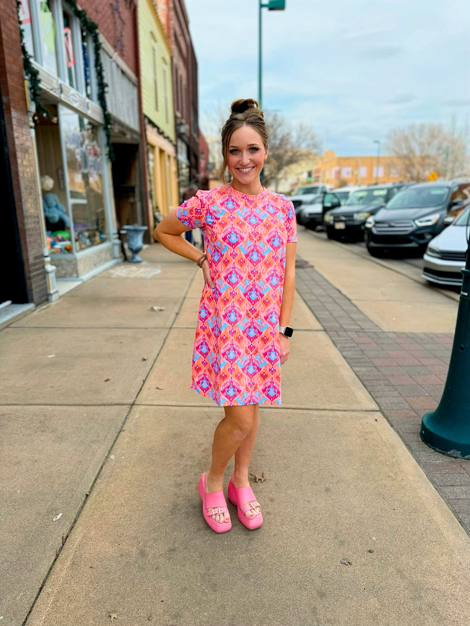 Our Augusta Dress features beautiful, bold patterns and an A-line silhouette, effortlessly elevating your beachside look. From lounging by the pool to strolling along the boardwalk, its versatile style ensures you're always looking your best for whatever the day may bring!