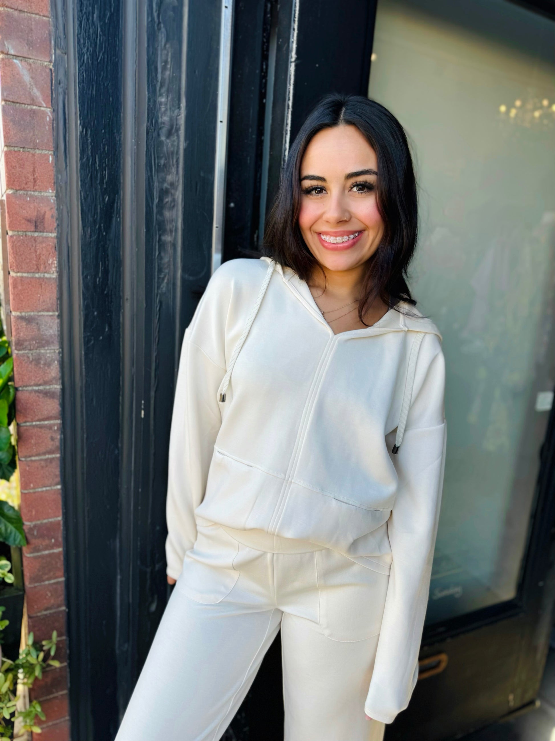 This is the perfect neutral cozy top to add to your collection! This top features a hood and drawstring combo along with a relaxed fit!
