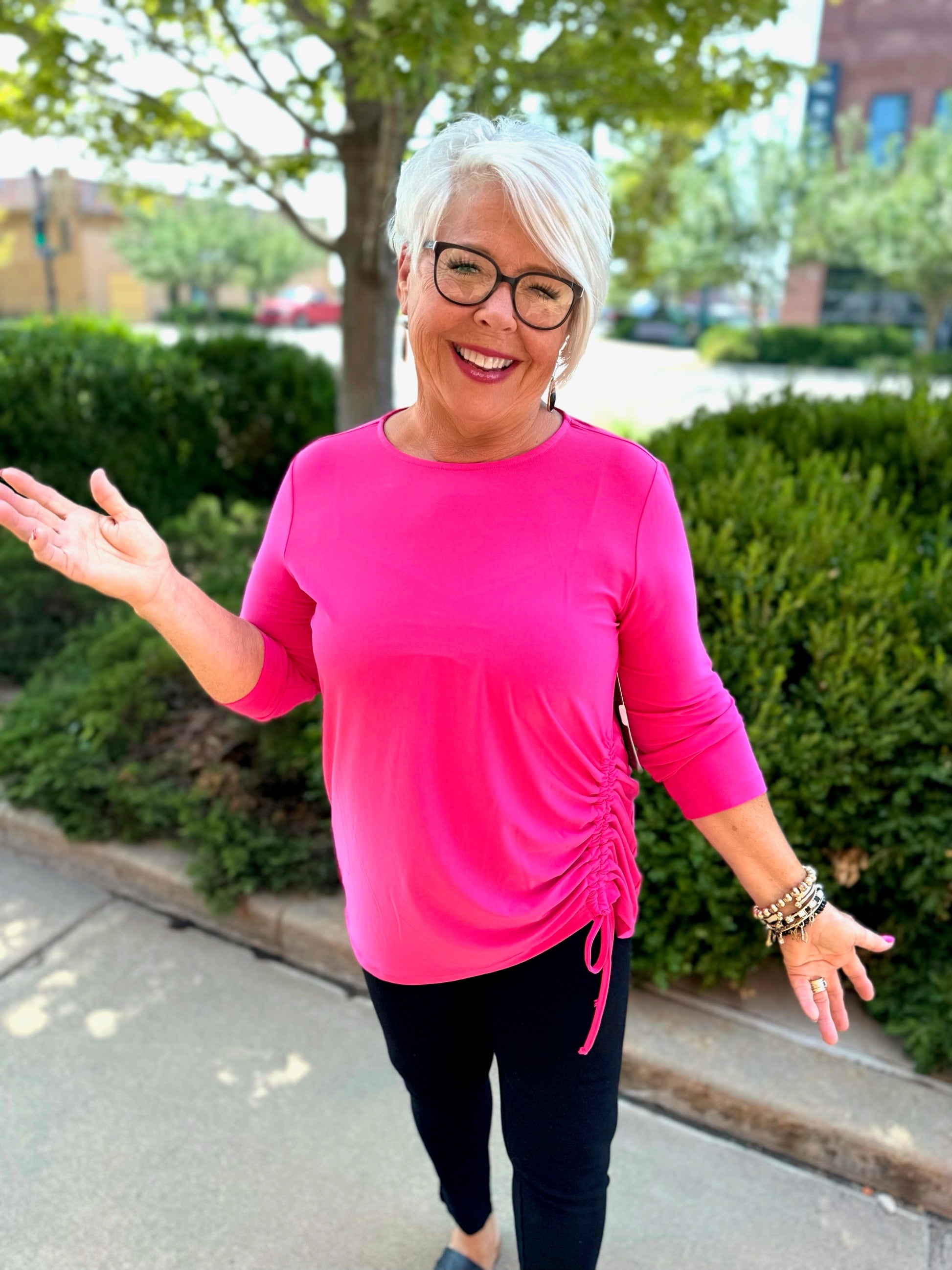 A deep fuchsia top that you can take from work to date night! This top features a 3/4 sleeve, side ruching, and a comfortable stretch material.