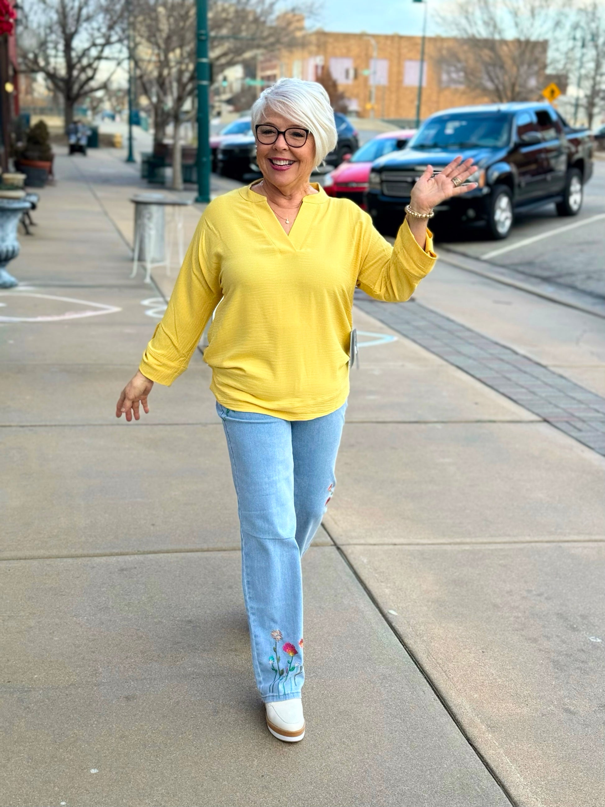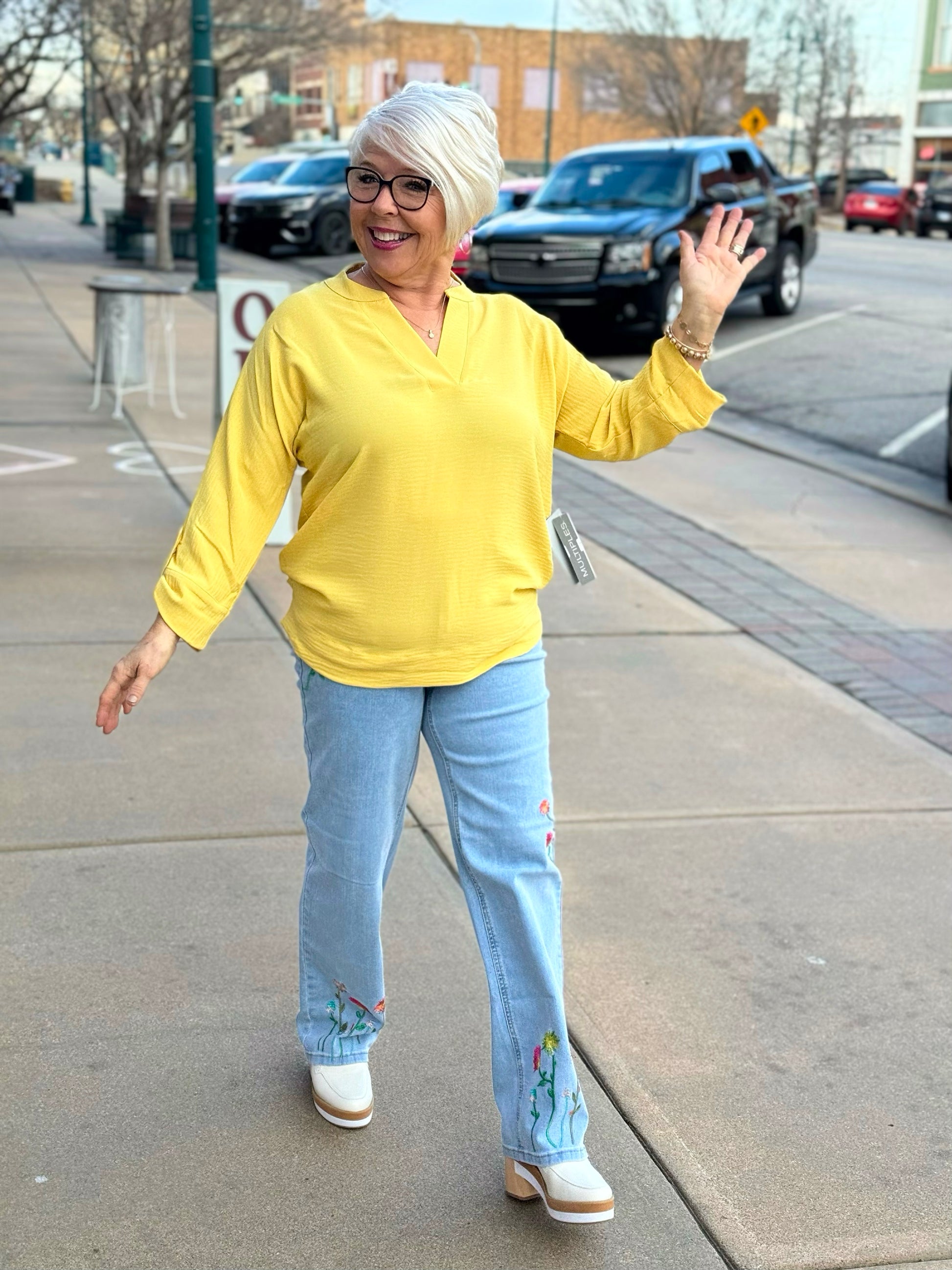 This better than basic top has a flattering split neckline with a slight collar. The flowy Dolman cut and three-quarter sleeves make it easy going and functional. With a solid black color, this is a highly versatile top that you can wear for so many occasions!