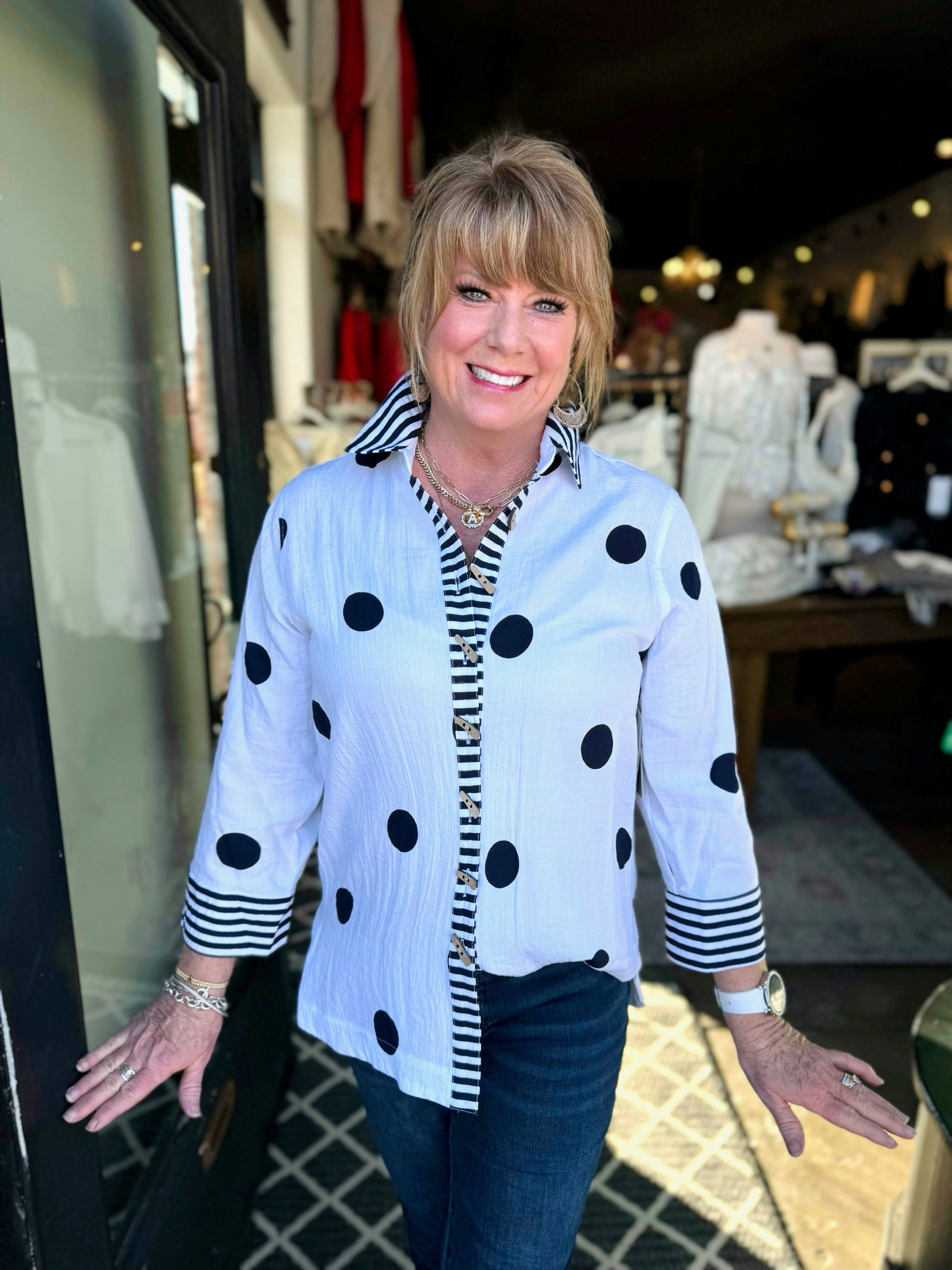 Add a playful yet polished touch to your wardrobe with this cuffed 3/4 sleeve button-front shirt. Featuring a unique mix of dot and stripe prints, this crinkle woven top offers a lightweight and breathable feel!