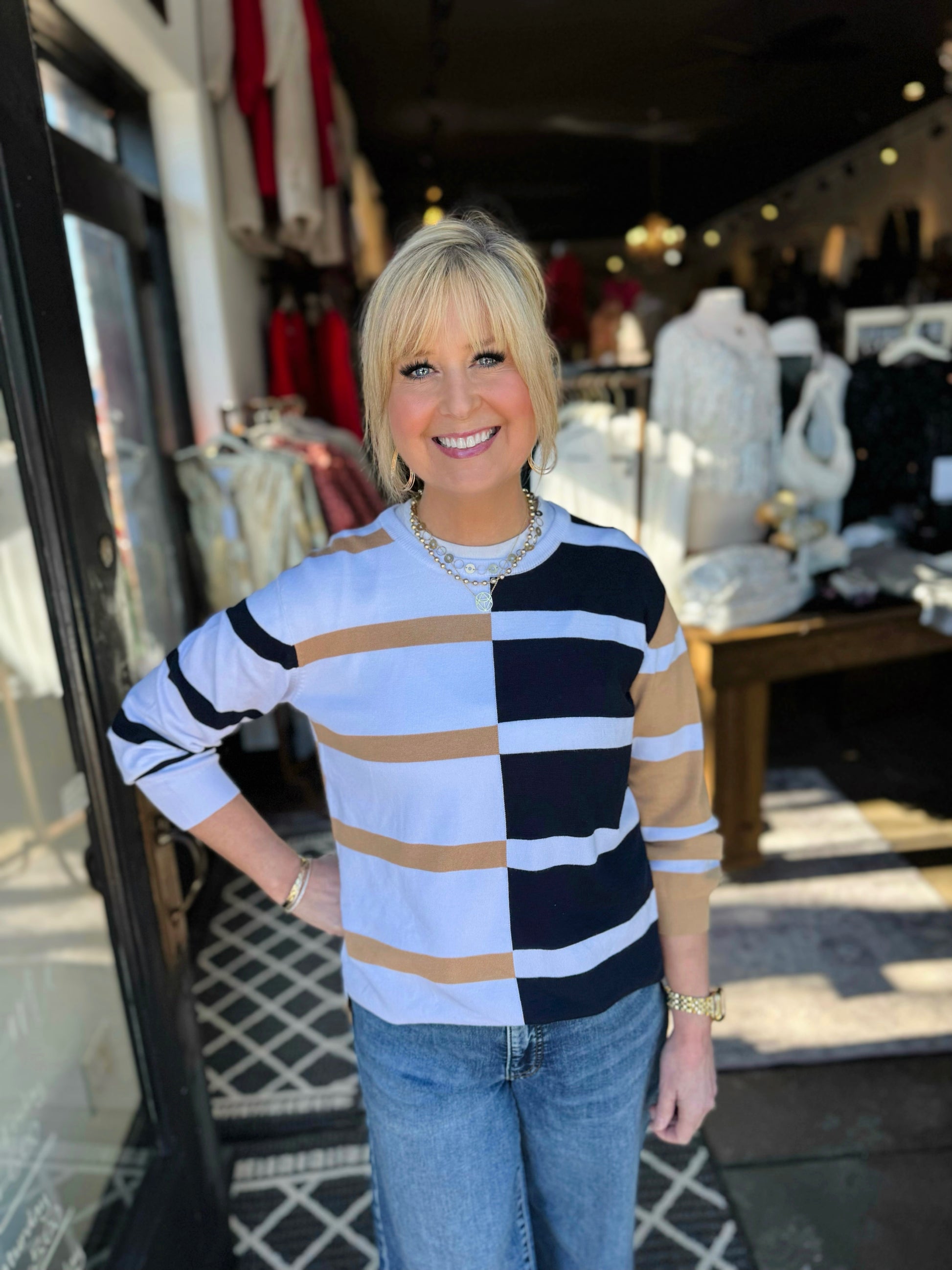 This stunning color block stripe sweater is an eye-catcher! It’s stylish and comfy with extra soft knit material and relaxed fit.