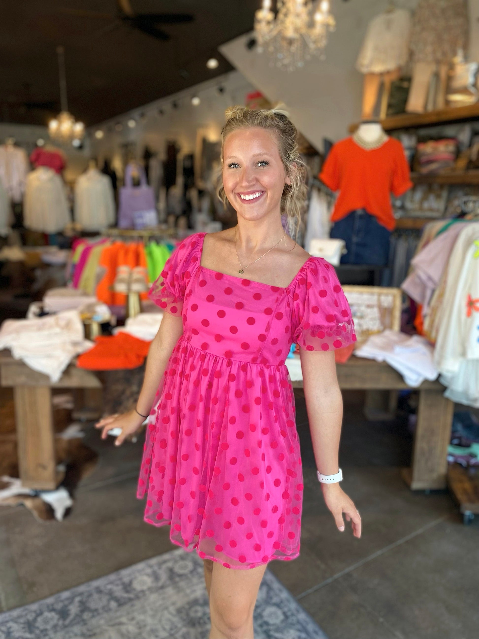 Perfect Polka Dot mesh puff Sleeve Hot Pink lined Dress