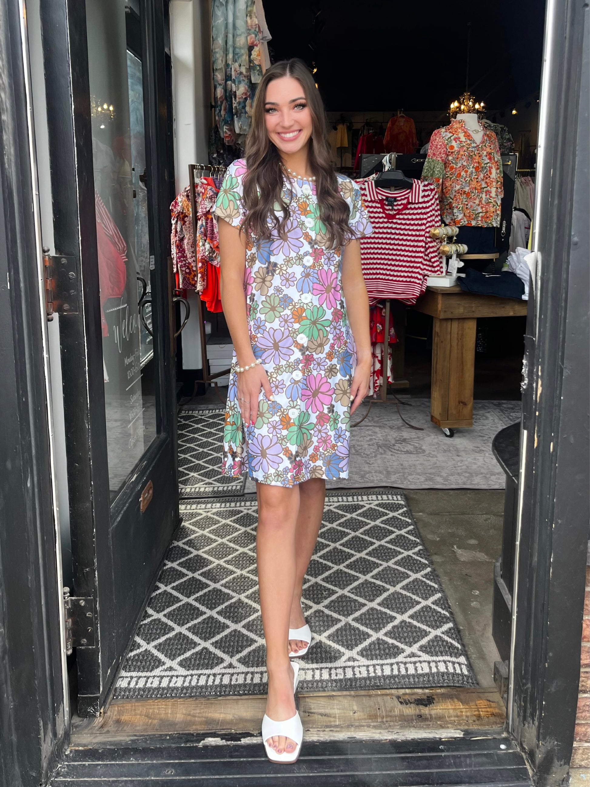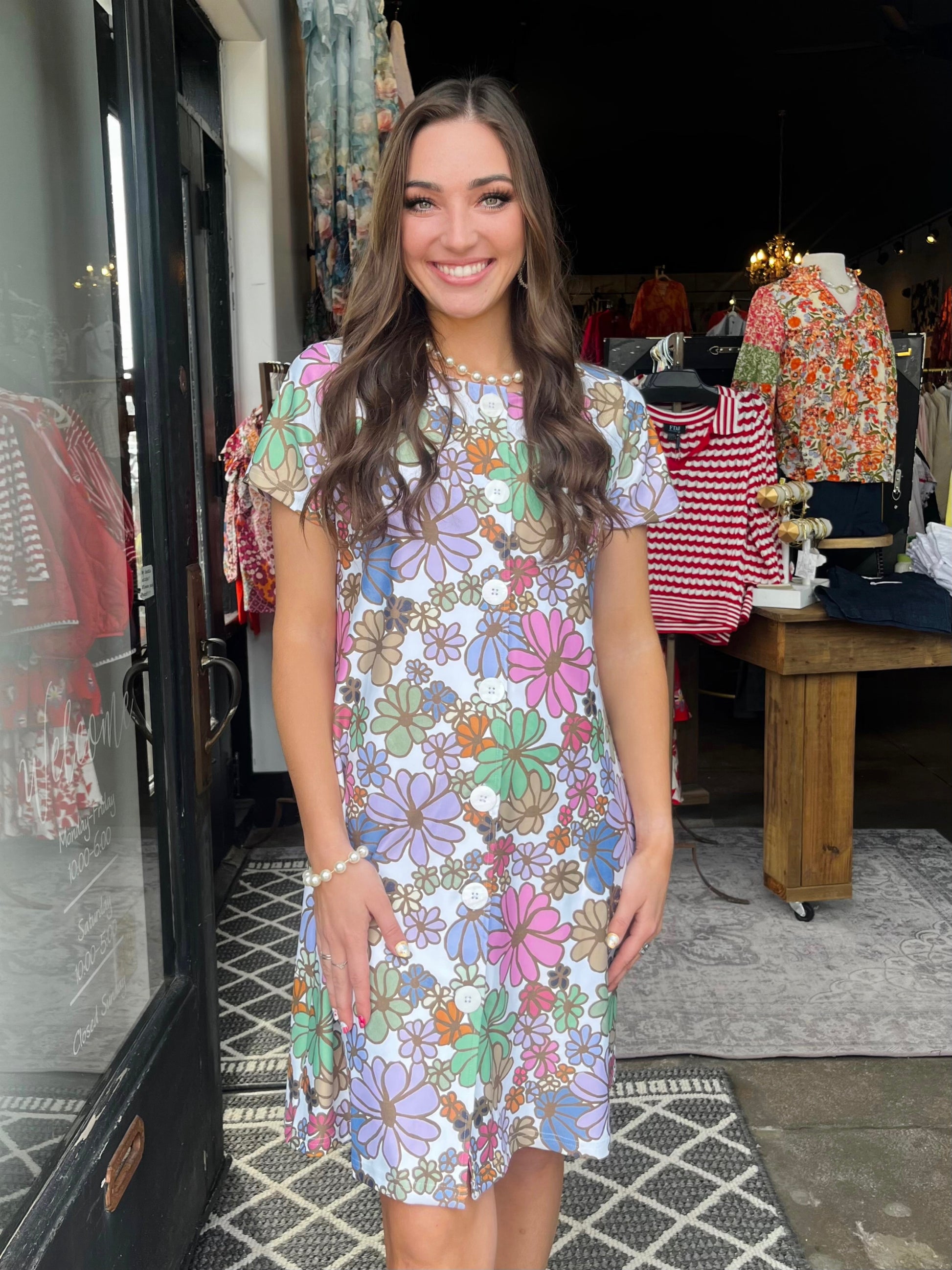Add a pop of retro charm to your wardrobe with this vibrant floral button-front dress! Featuring a playful mix of pastel and bold hues, the all-over daisy print brings a fun, vintage-inspired vibe. Lightweight and breezy, this short-sleeve dress is perfect for spring and summer outings. An effortless blend of style and comfort!