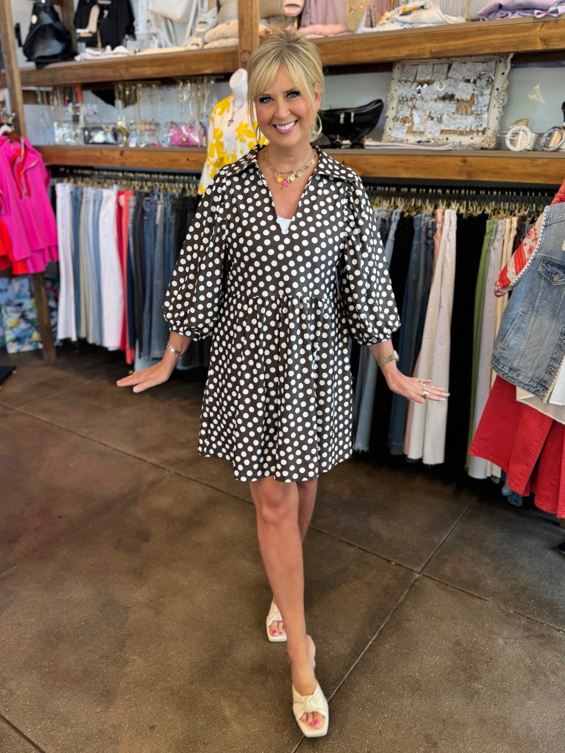 A playful twist on a classic—this chocolate brown dress with crisp white polka dots brings vintage charm with modern ease. Featuring a relaxed fit, puff sleeves, and a flattering gathered waist, it’s the perfect piece for casual days with a pop of personality!